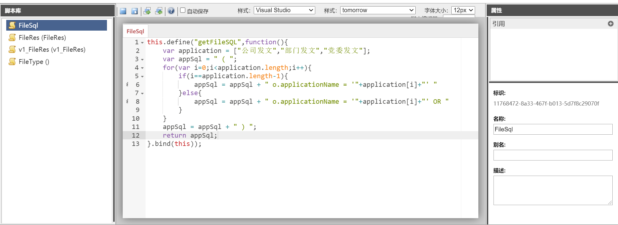 * 1、在内容管理应用中有一个fileres的应用,在该应用中创建一个脚本,命名为filesql,并定义方法。