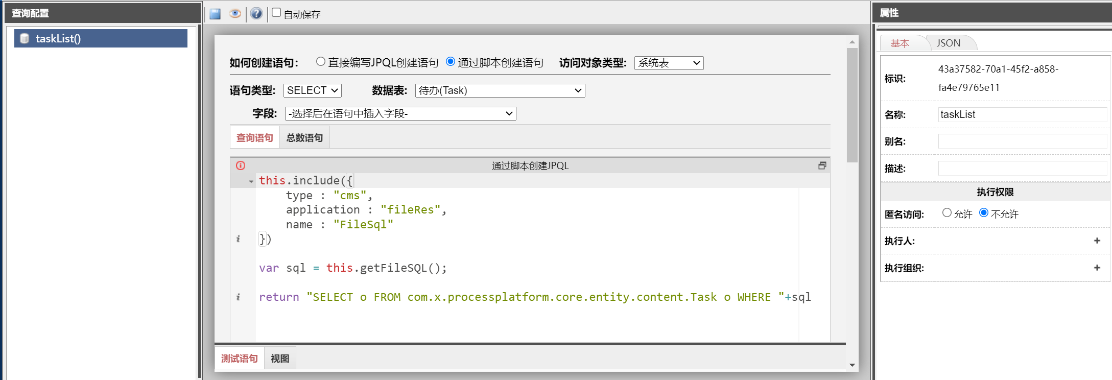* 样例一:在通用脚本中定义一个通用的方法去获取公文管理所有的文种,在查询语句中根据该方法来拼接jpql。
