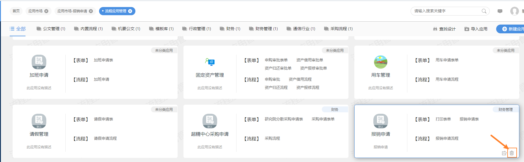 点击“报销申请”的删除图标,并且确认删除“删除选中的应用”