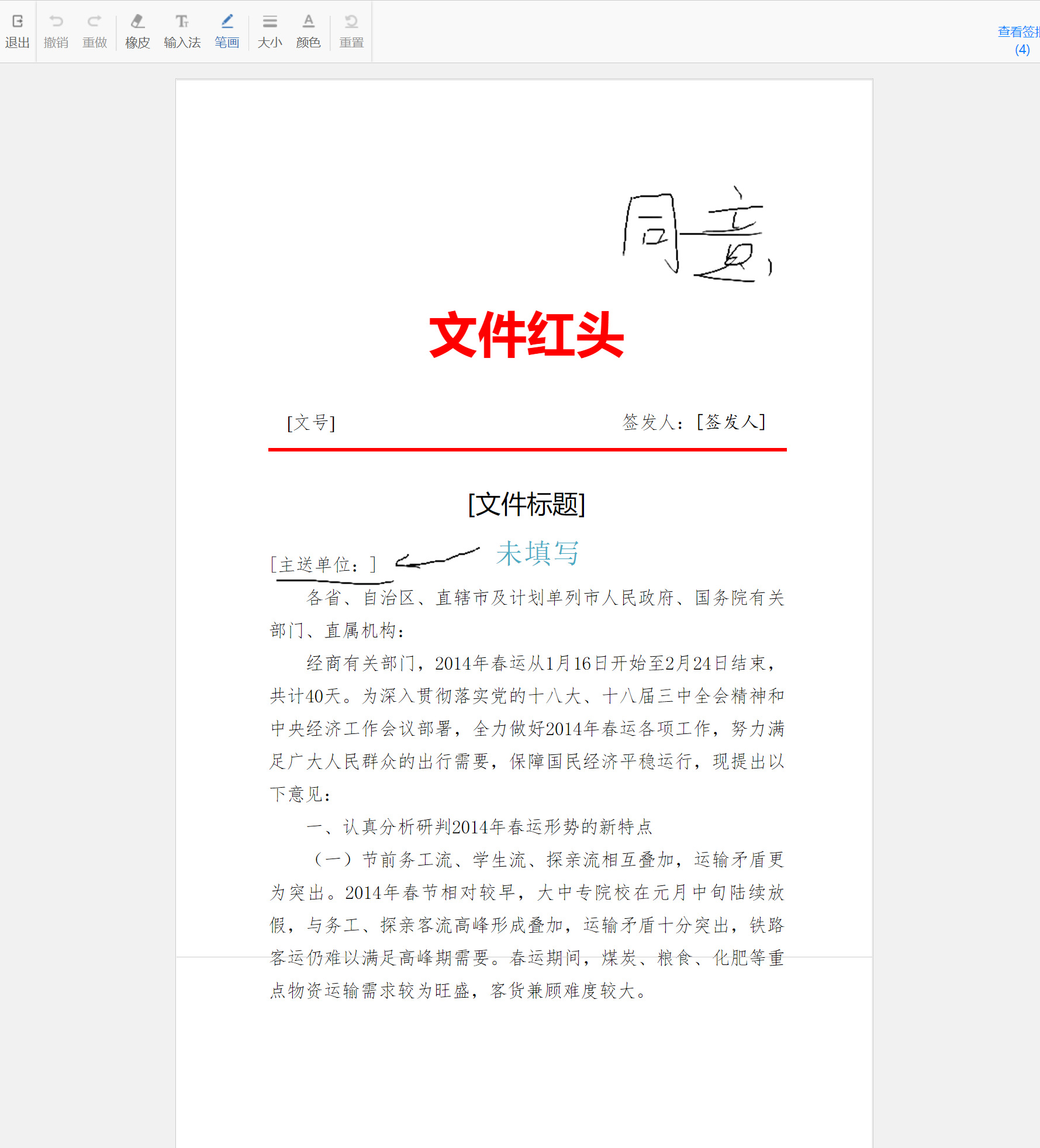 手写签批是建立在金太阳下载开发平台的公文编辑器组件基础上,允许用户在公文内容上进行手写、签名、批注、文字输入、擦除的一系列功能。手写签批功能可以直观的展现每位处理人对公文内容的批注,有效的提高办公效率。