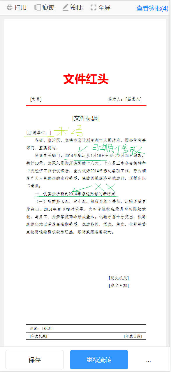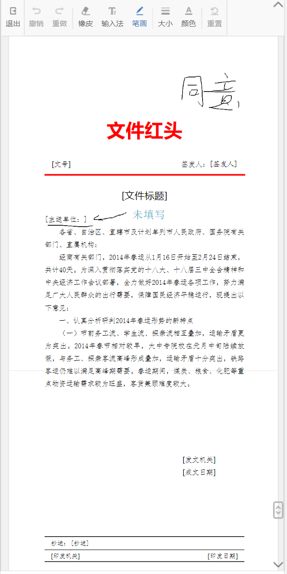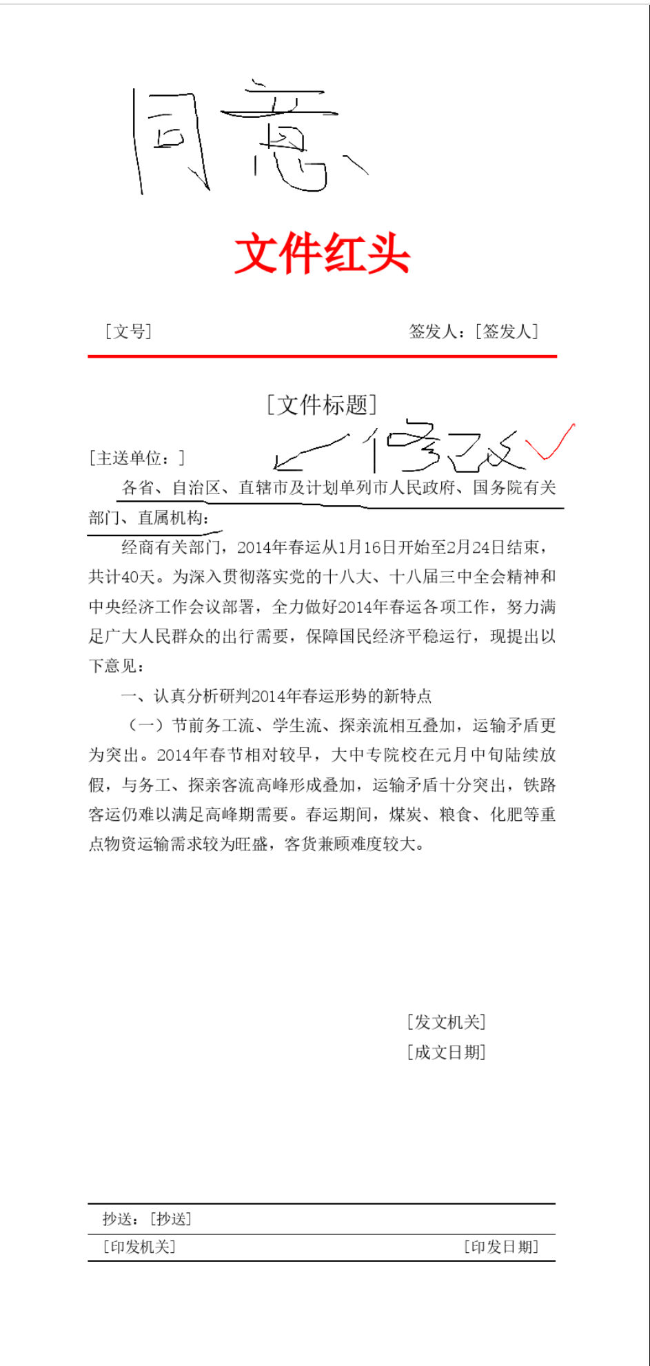公文正文可能在流程的一些节点被修改,比如发文。这种情况下进行手写签批,需要考虑到正文内容位置的变化对签批内容的影响。我们会把公文正文作为手写签批的背景保存下来,每个处理人的签批分别展现。