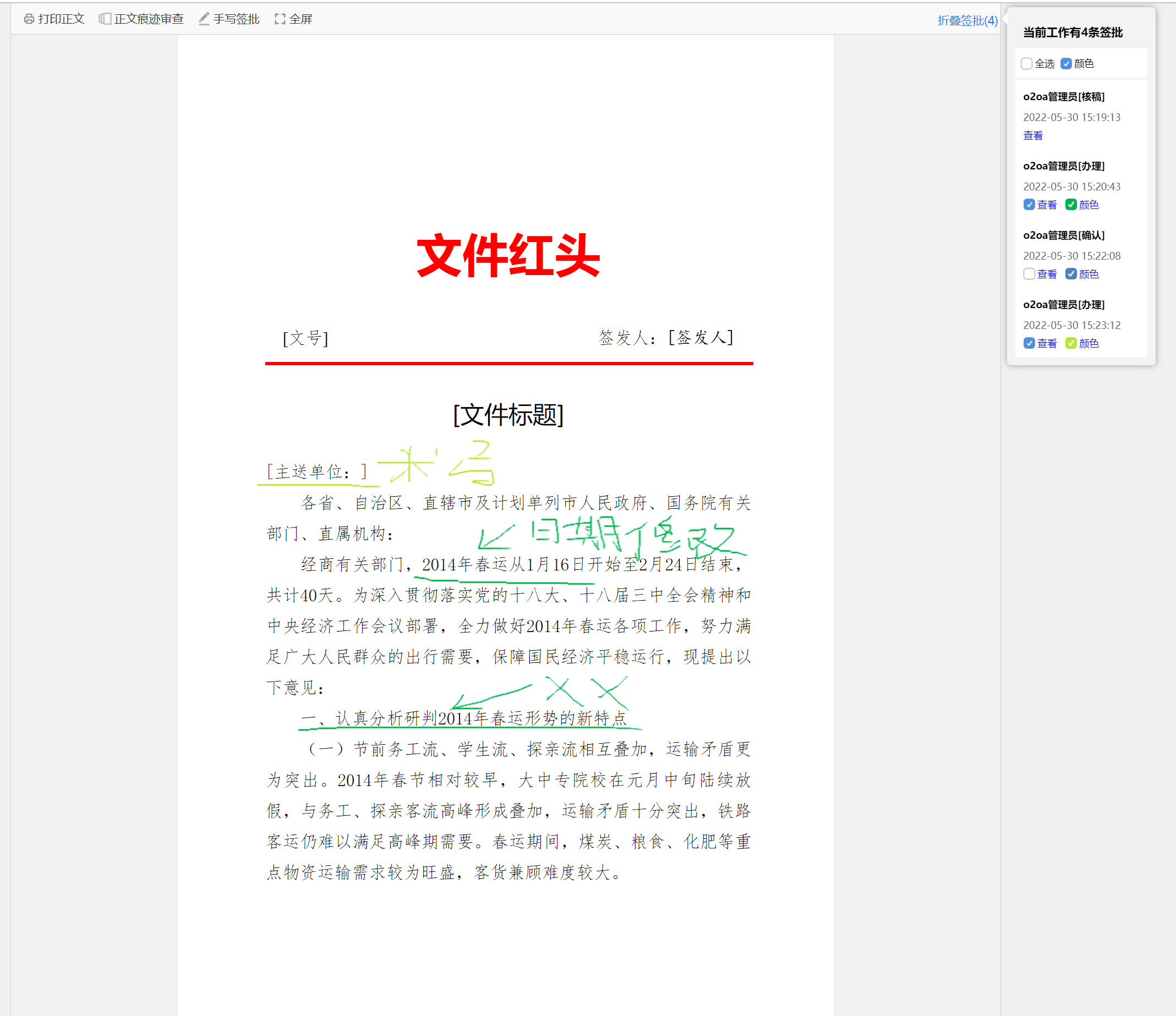 在一些流程中,比如收文,正文内容不会被修改,这个时候可以设置手写签批不保存正文。这种场景下的手写签批文件,系统可以叠加多个签批展现,并会以不同的颜色来区分不同处理人。