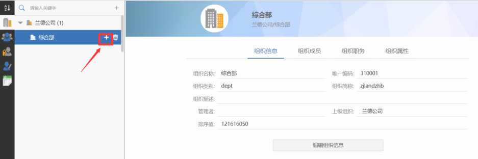 操作方式如前面所述,在该部门下创建下级部门,则点击该组织右侧的“ ”按钮,可创建该部门下一级部门,操作步骤同上,如下图所示: