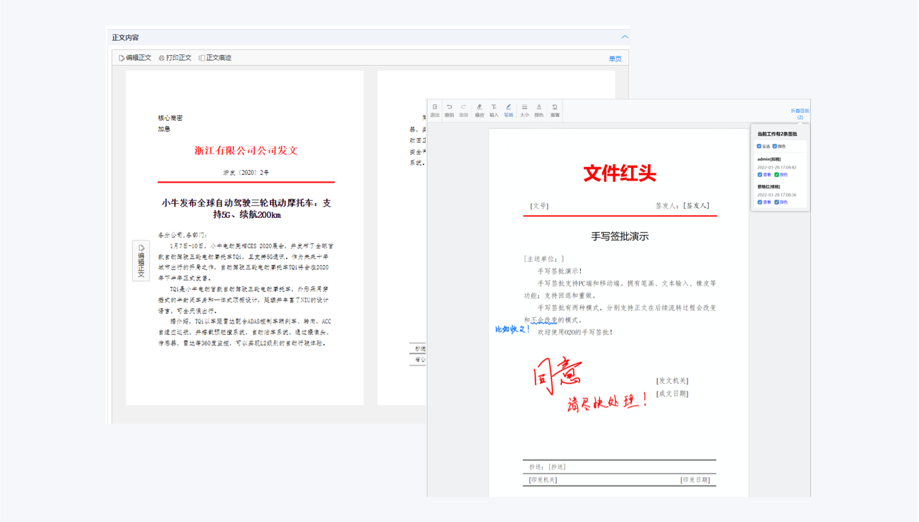 为使用者提供直观易用的编辑界面,方便用户快速创建和编辑公文,而不用过多纠结公文标准与规范。自动格式识别、修订痕迹保留与手写批注让使用者拥有更加友好的用户体验。