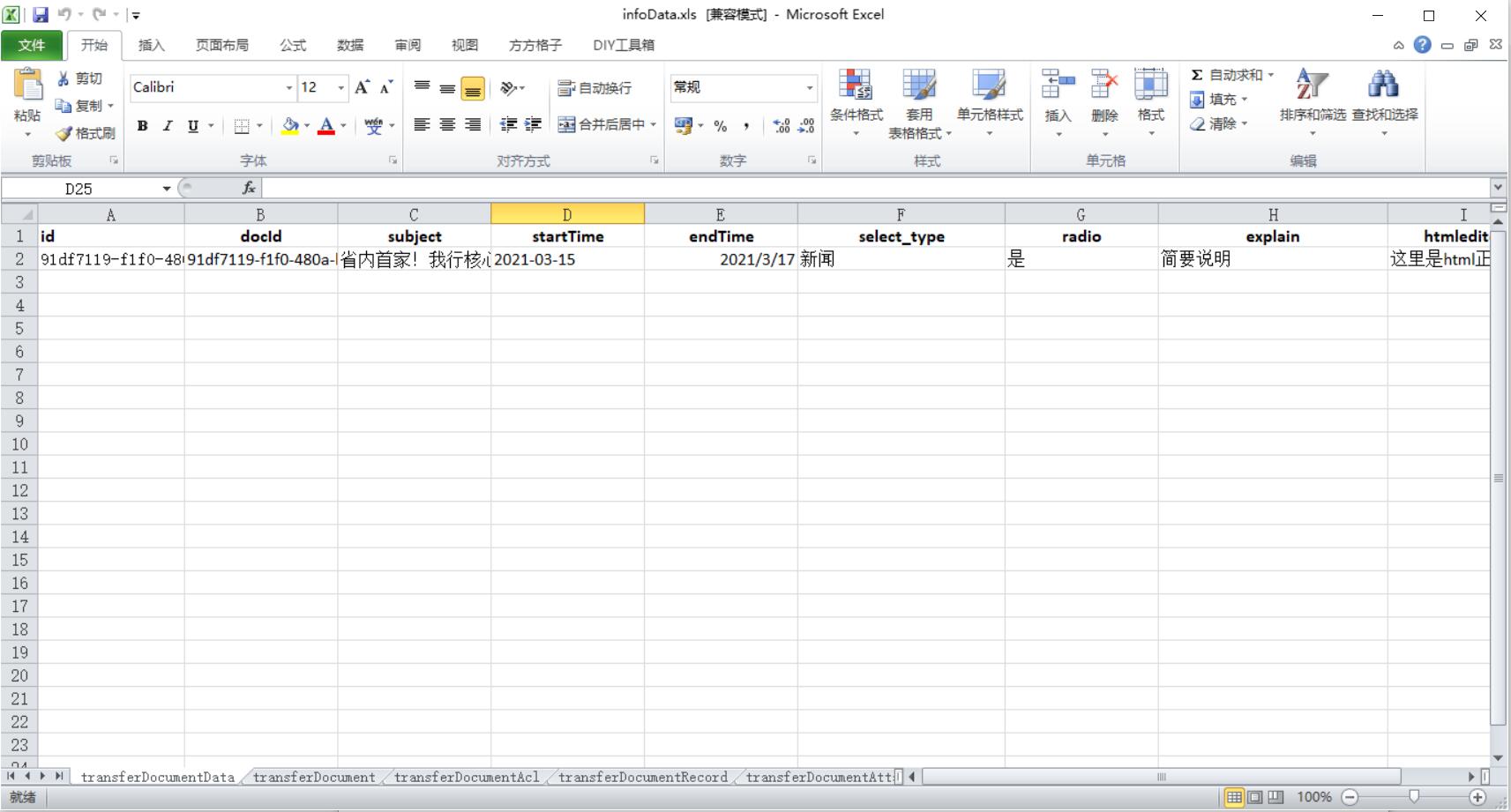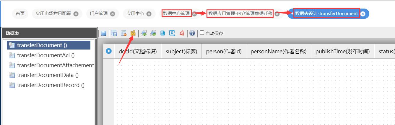 transferdocumentdata:对应信息发布的业务数据。注意:transferdocumentdata表中的列标题id和docid不可增删改。