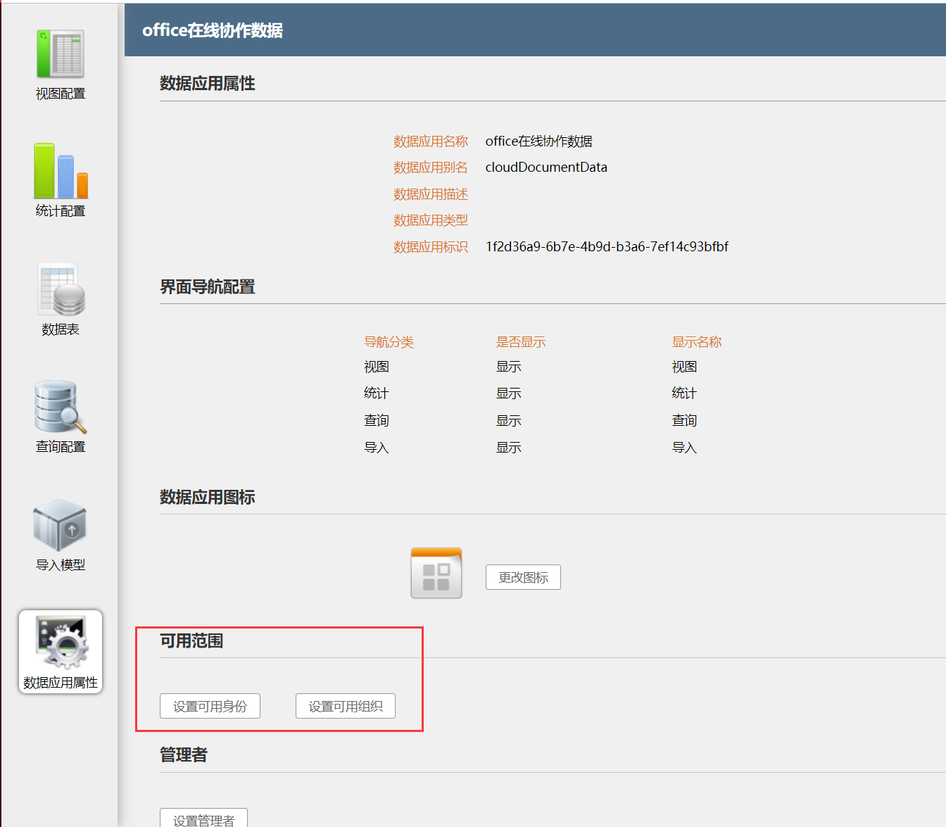 注意:安装后数据中心中会多出一个“office在线协作数据”,默认所有人都有权限查看,但是内容是空,这里需要管理员手动去配置一下可用范围,使普通员工没有查看权限。