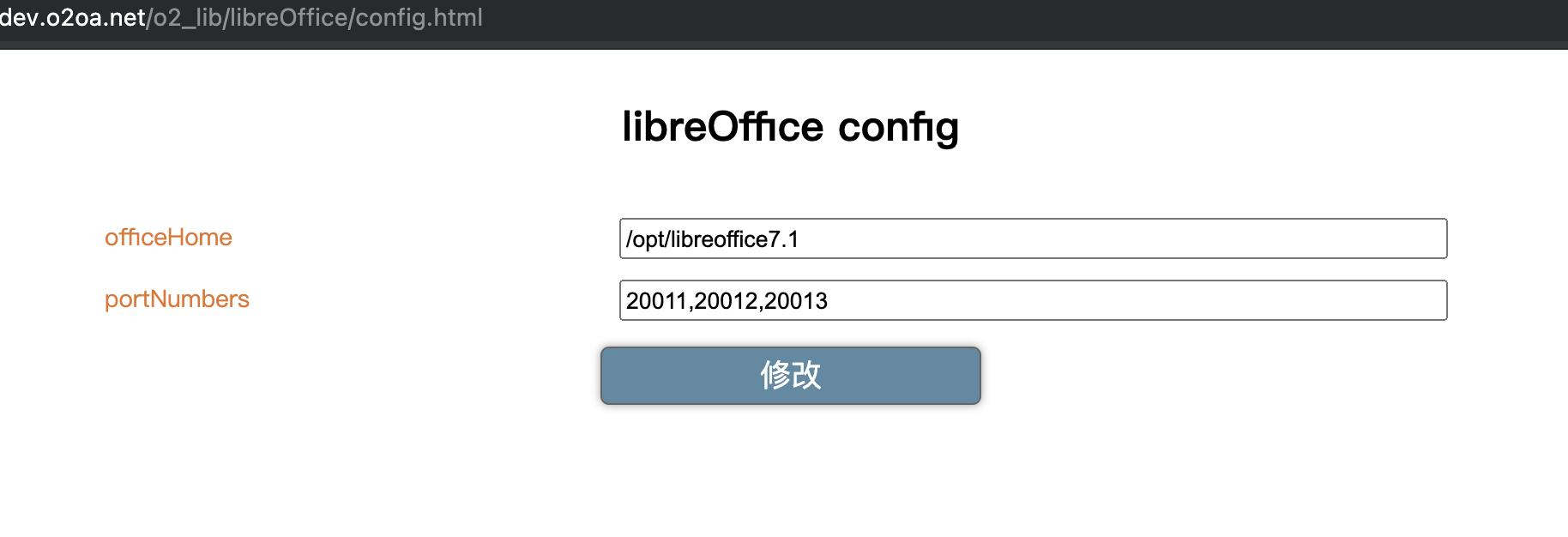 2、配置libreoffice,进入http://*o2server*/o2_lib/libreoffice/config.html,配置officehome(libreoffice安装目录,如:/opt/libreoffice7.1)、portnumbers(o2server与libreoffice连接的端口,默认3个端口:20011,20012,20013)