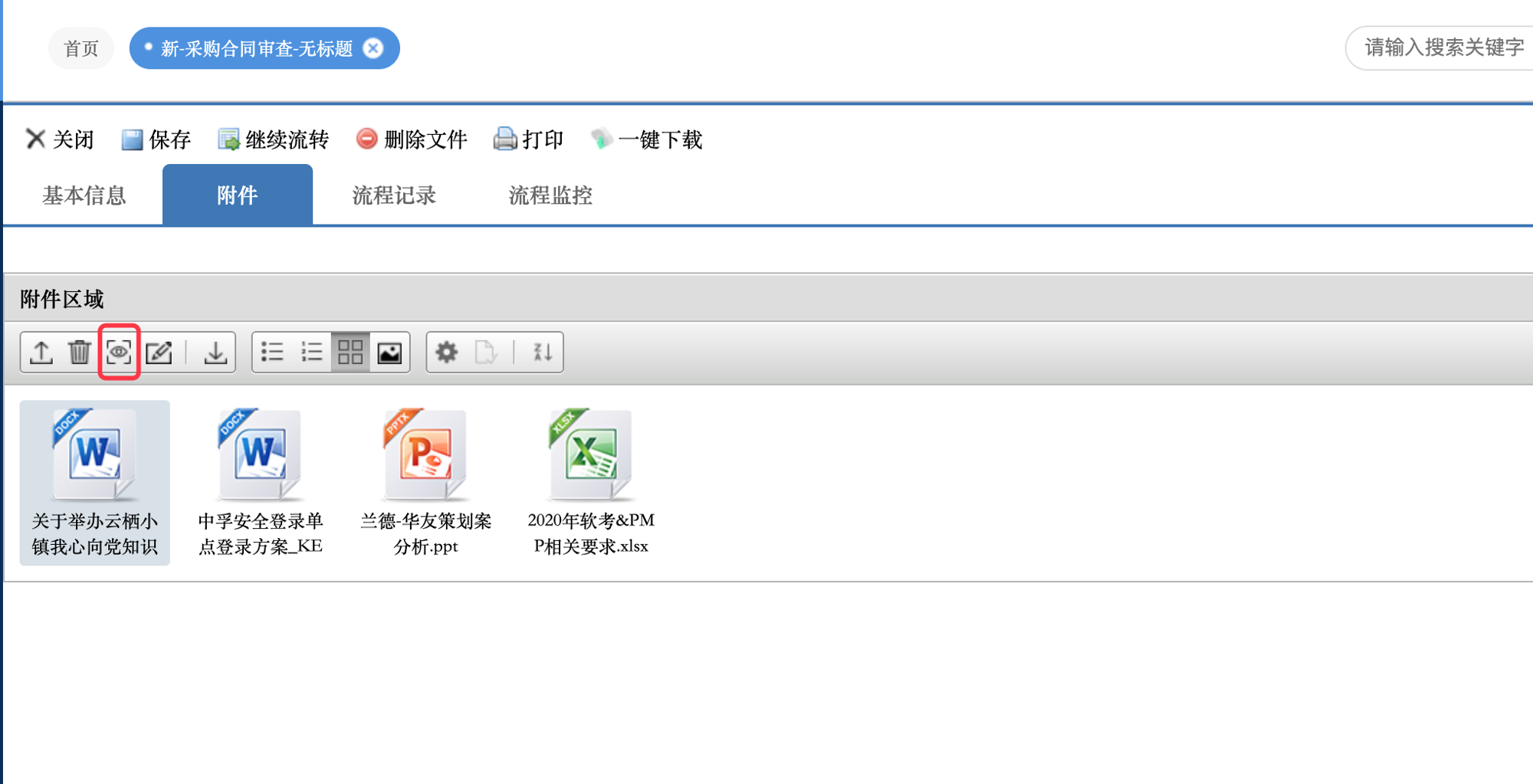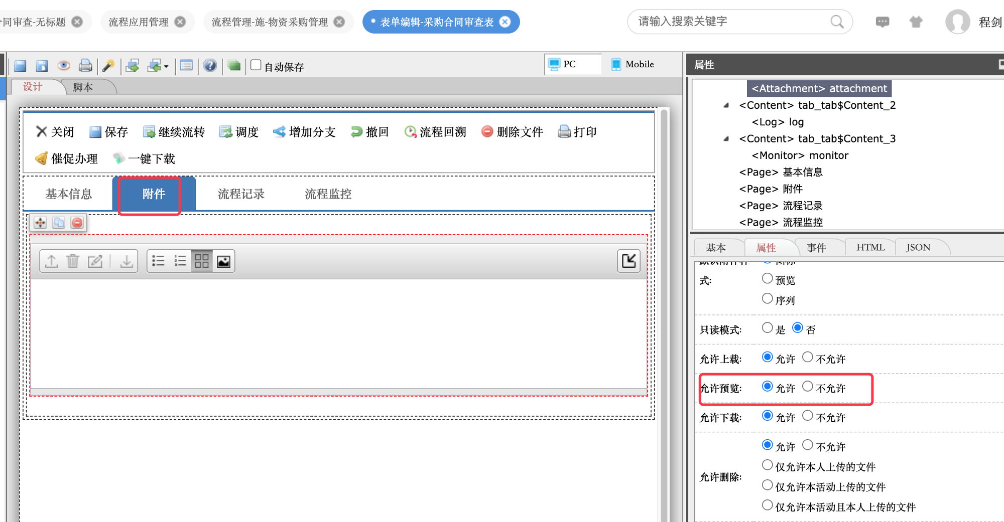 3、启用office附件预览,进入到流程平台流程表单的附件组件,在属性中设置启用预览