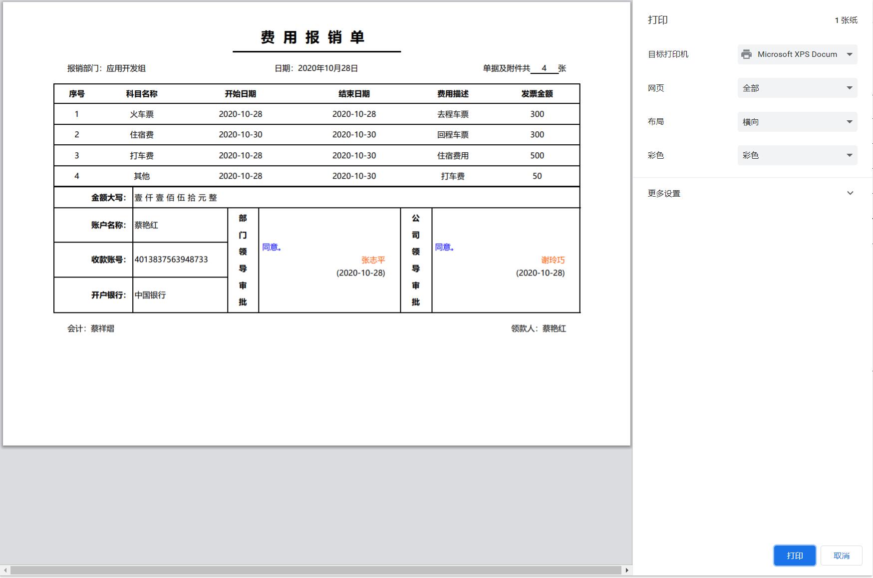 流程结束后,还可进行报销单的打印。点击打印按钮即可调到打印界面,然后利用浏览器自带的打印功能进行打印,方便员工留存和归档。