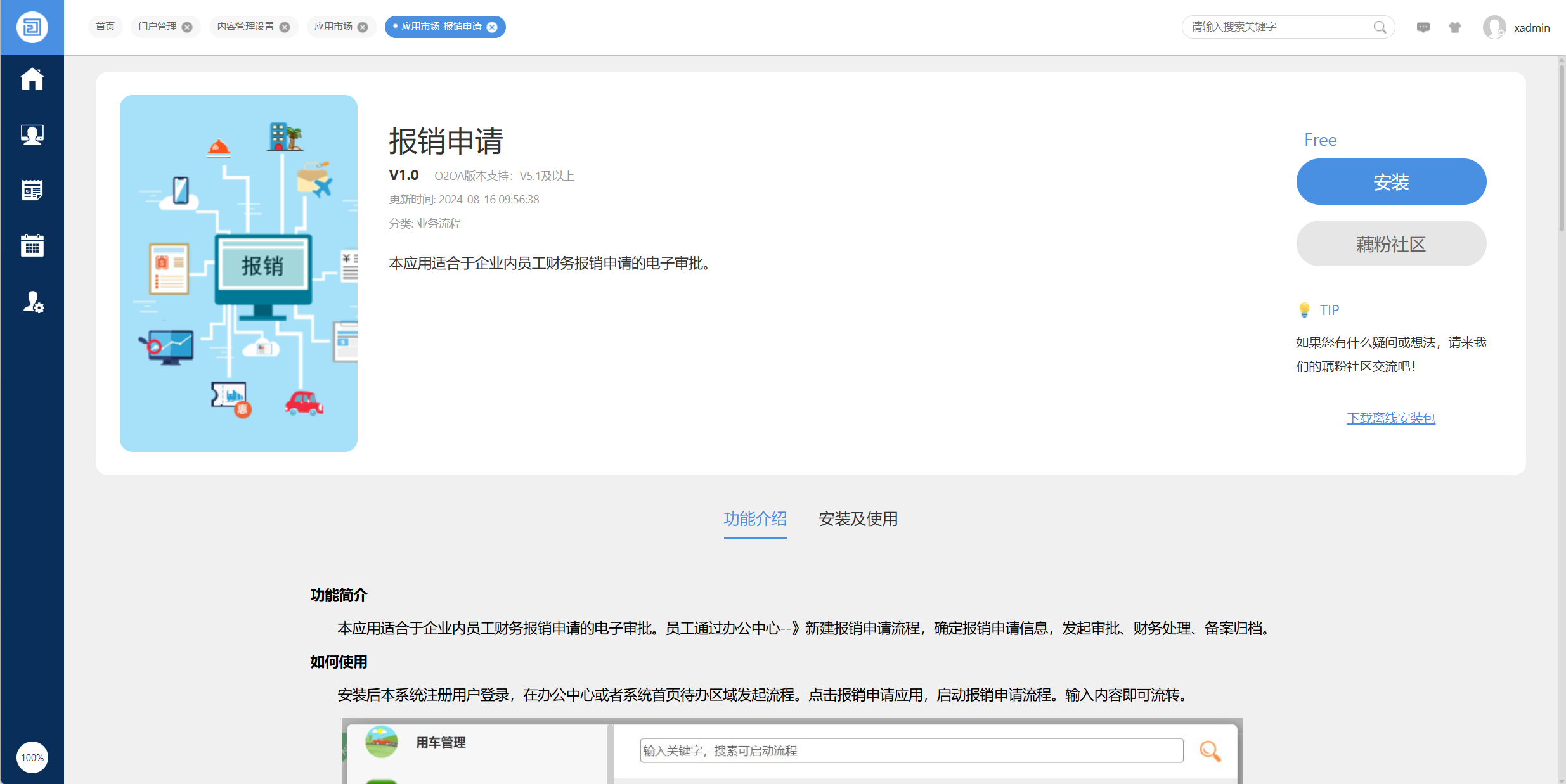 如果服务器已经连接了o2云,则可以直接在应用市场搜索[报销管理]进行安装(应用市场安装过程暂时不做赘述)。