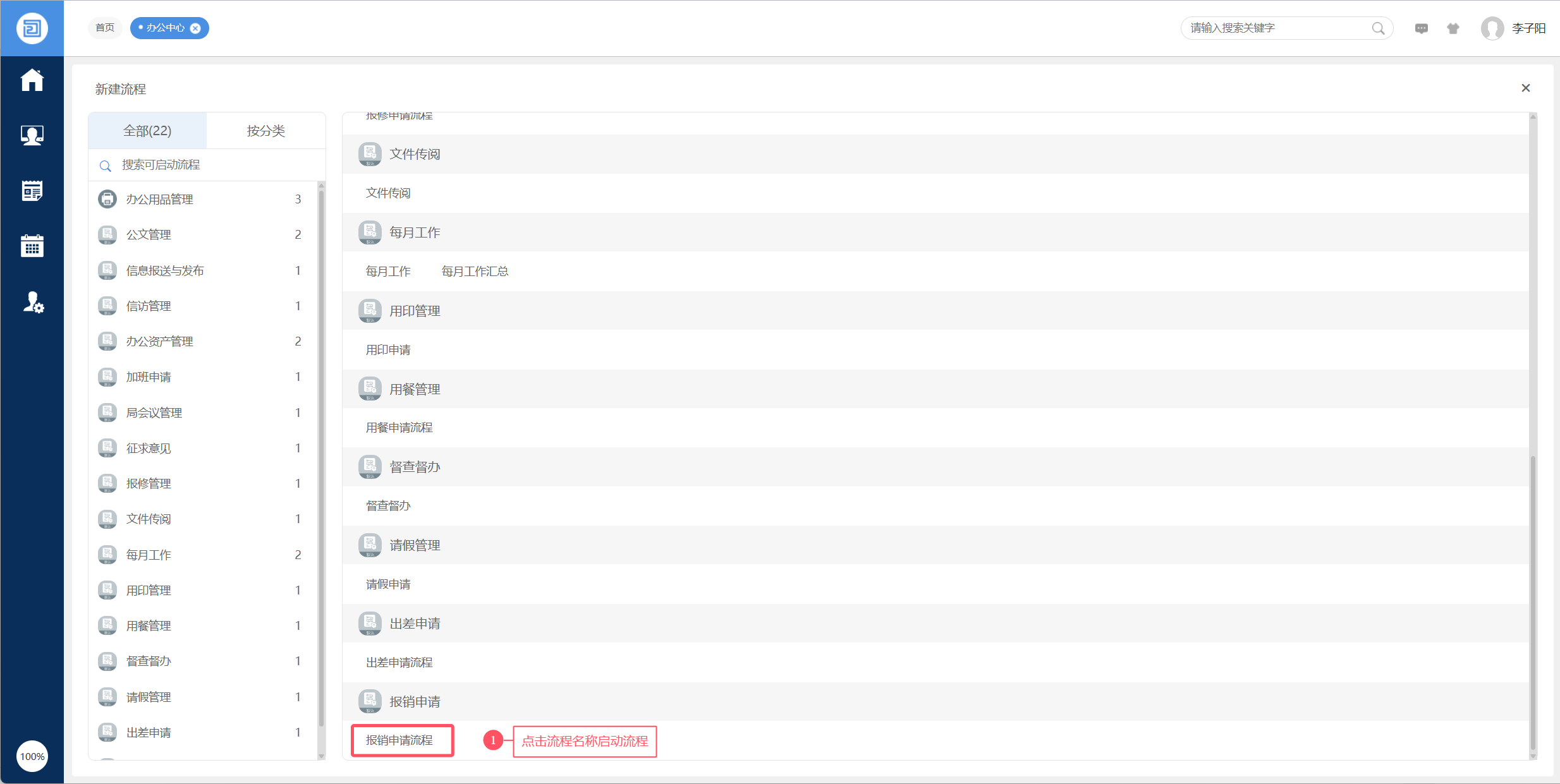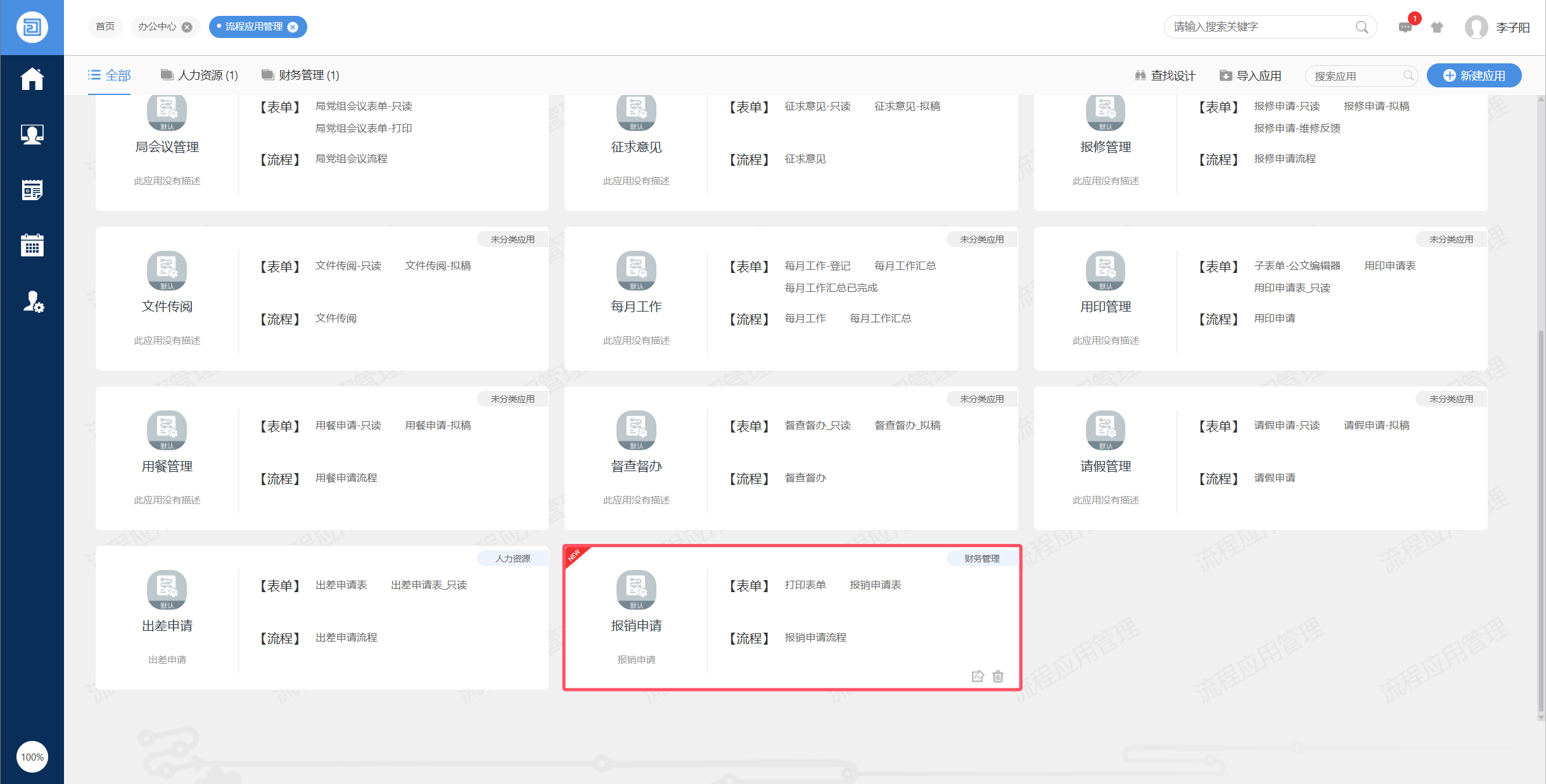 打开系统菜单-流程管理,找到流程应用[报销申请],如下图所示: