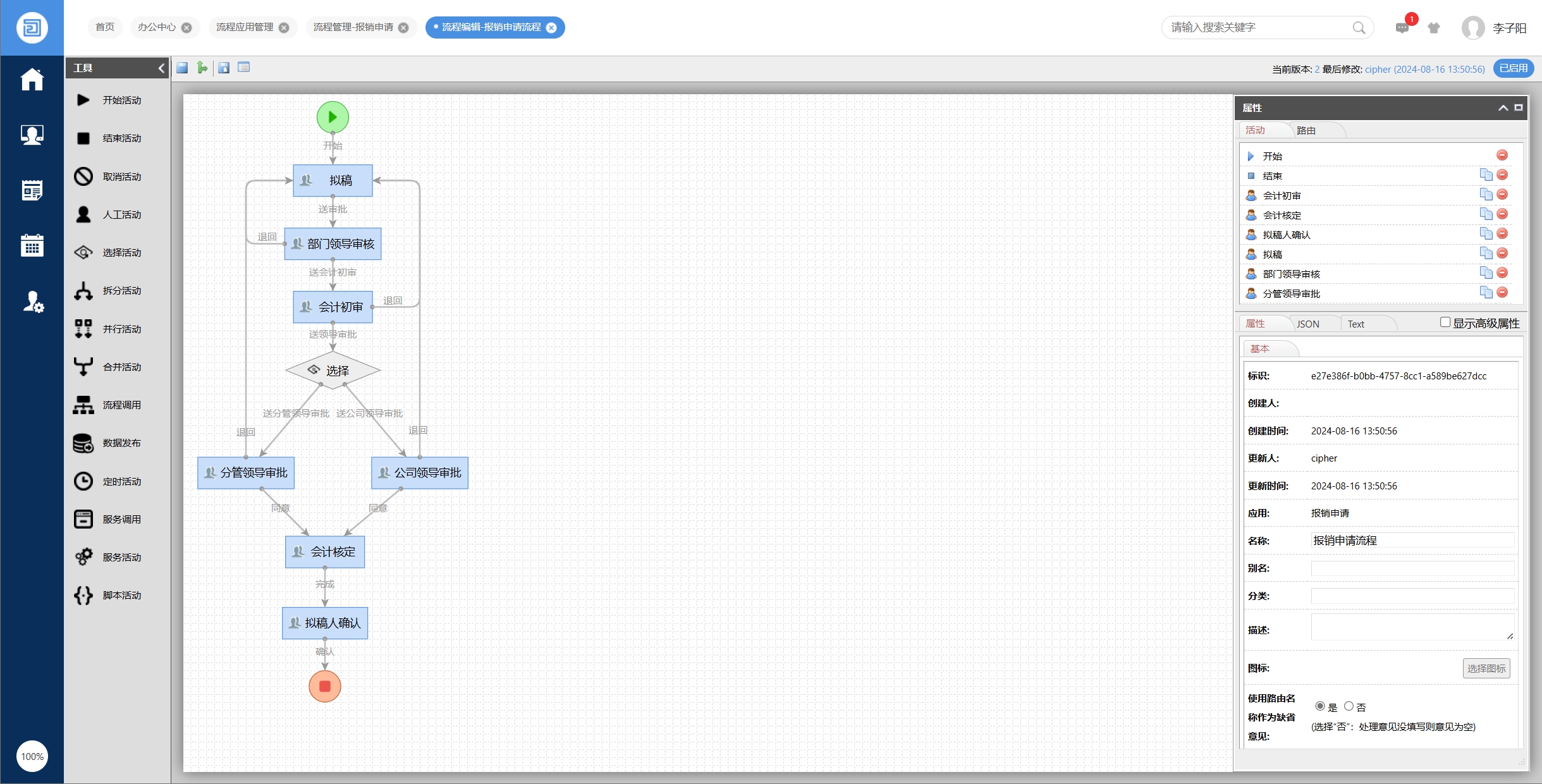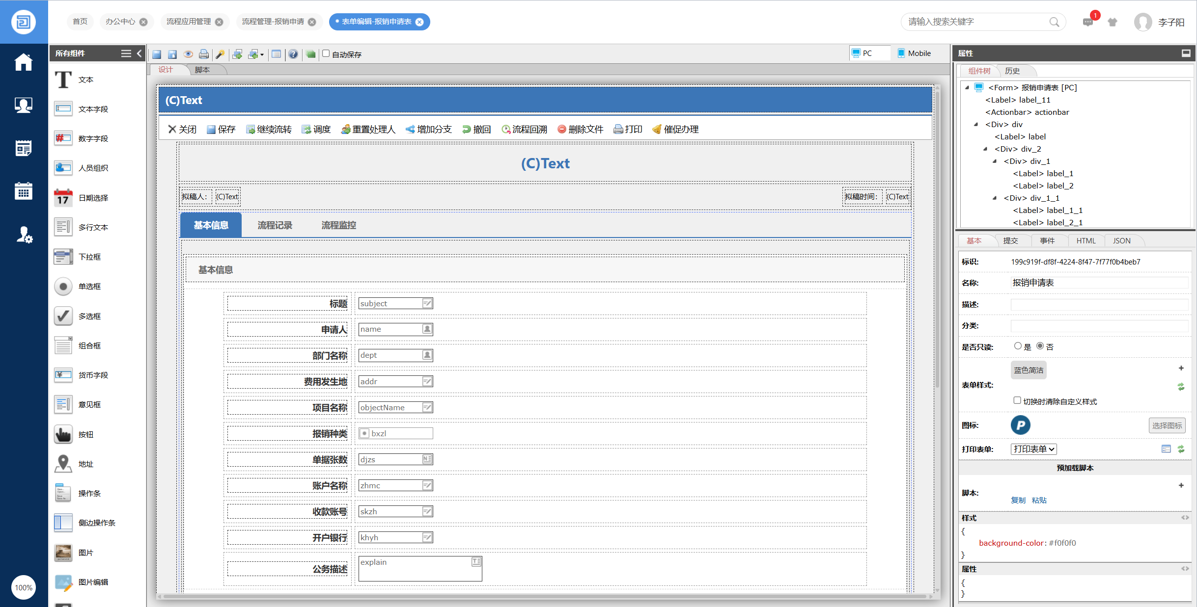 可以在此流程应用中对流程表单,流程审批过程按实际需要进行修改与调整: