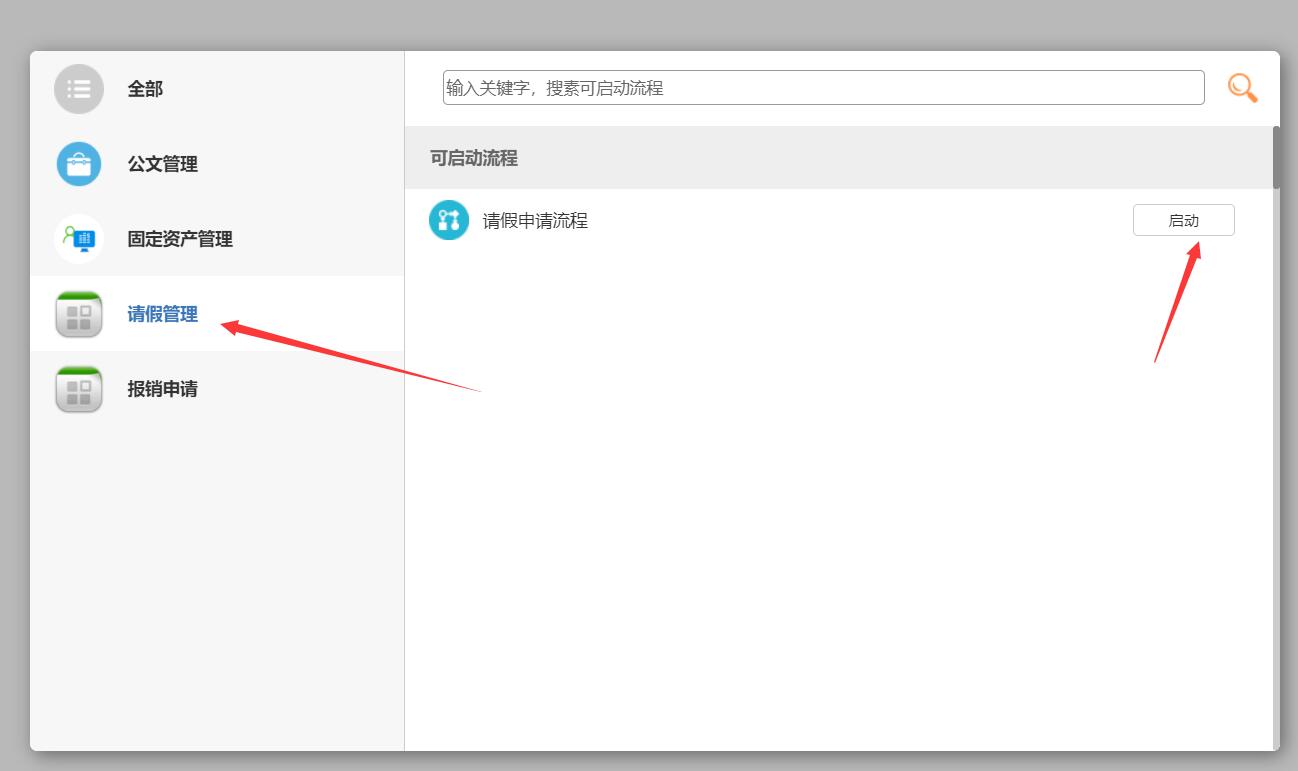 1、流程管理平台:请假申请管理。