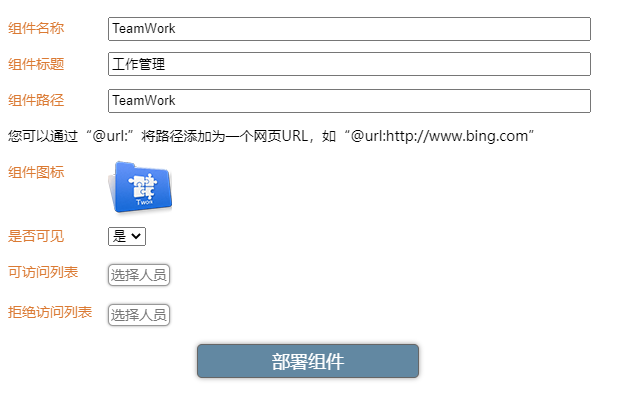 2、点击"部署组件" 组件名称: teamwork 组件标题:工作管理 组件路劲: teamwork ,点击部署组件