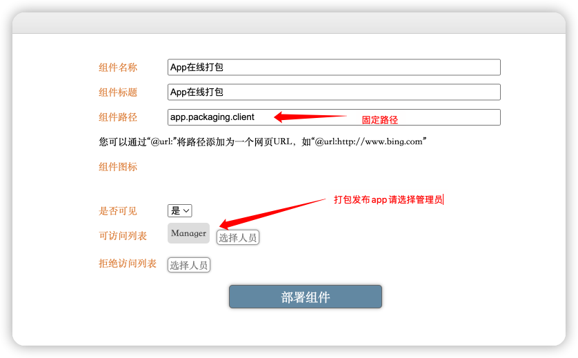 这里模块部署,需要填入的组件路径为固定值: app.packaging.client 。请选择管理人员作为打包应用的访问者,在线打包app只需要管理员去操作就可以了,发布后用户就可以下载app了。