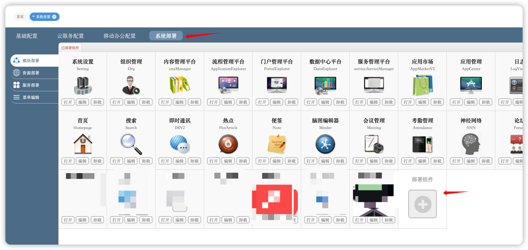安装系统组件。使用管理员登录,打开开始->应用->系统设置->系统部署->模块部署