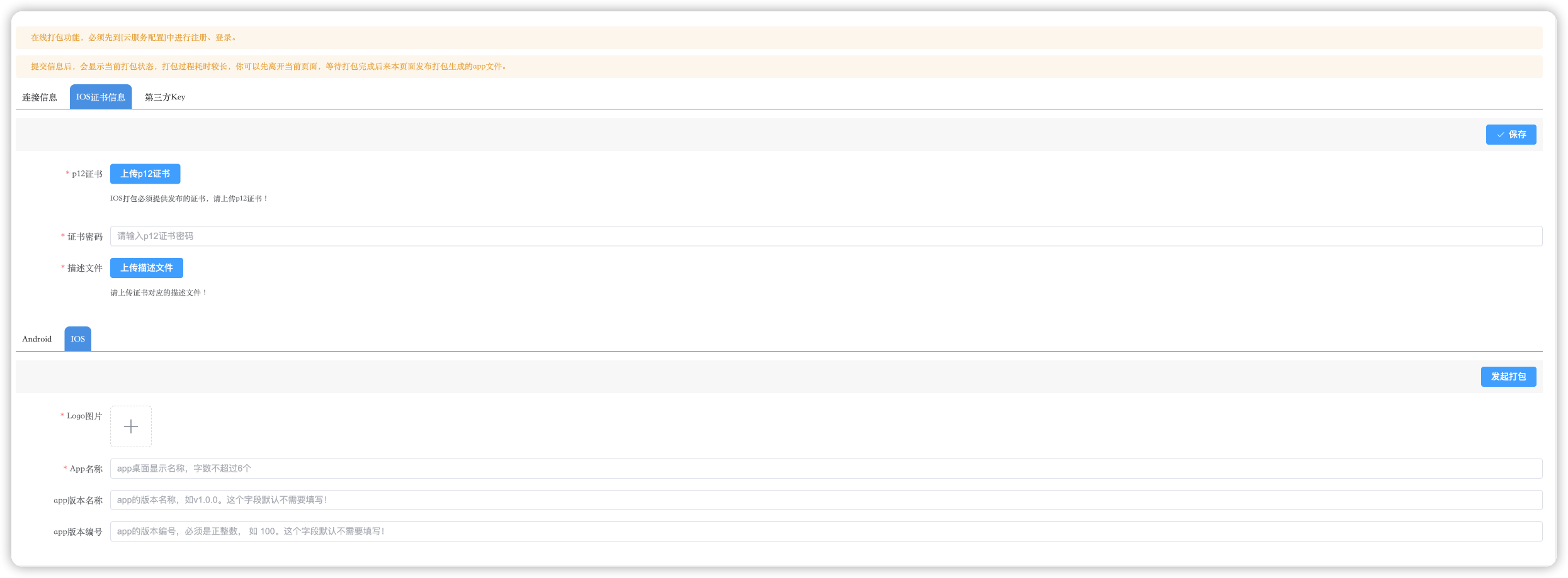 在 ios 选项卡中,填写ios app需要的一些信息,但是ios打包必须提供ios的开发者证书,比如公司证书、个人证书,具体可以看ios证书信息选项卡。