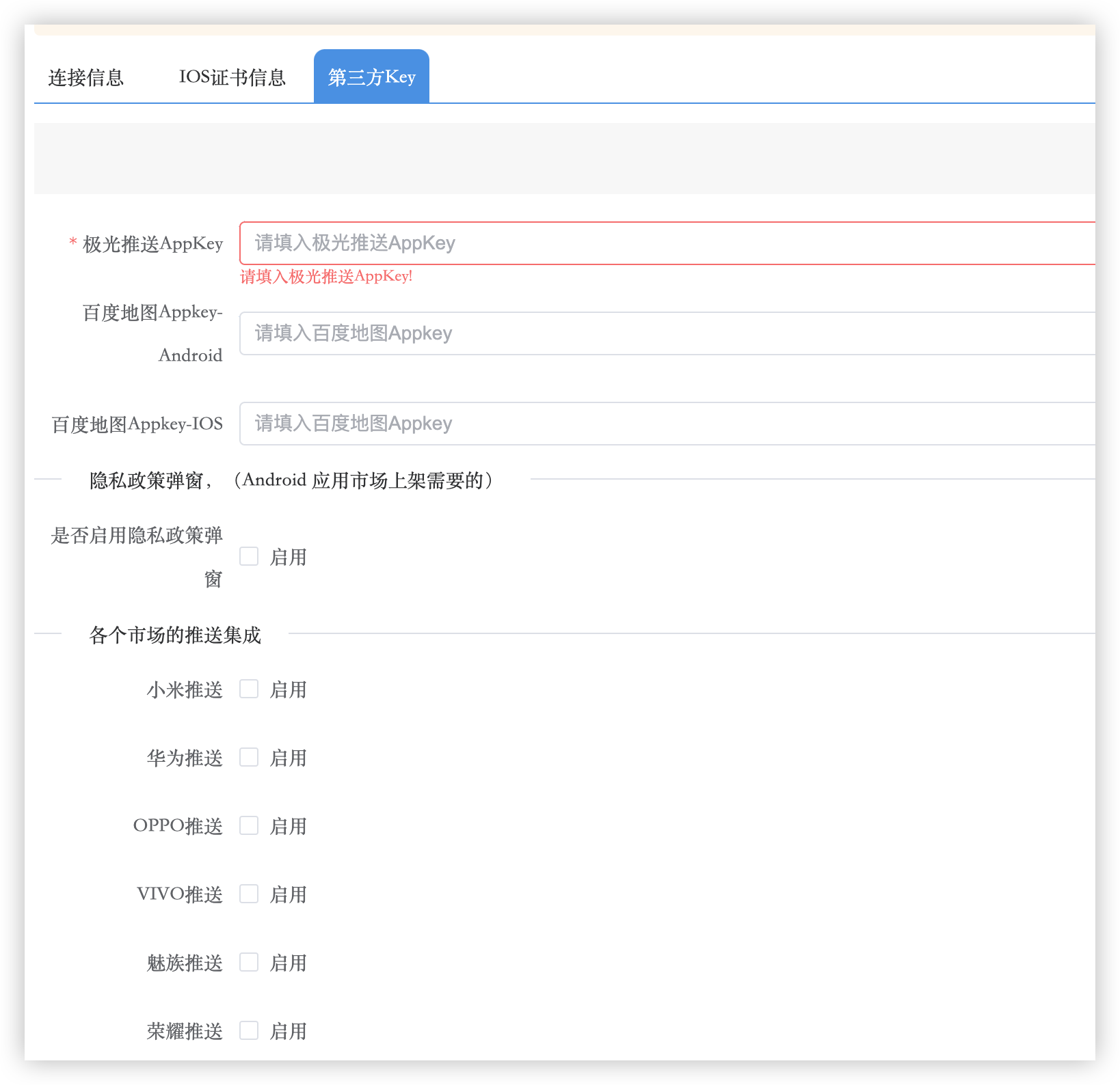 第三方 key 里面,极光推送的 appkey 必须填写,请到极光官方注册应用。具体可以参考https://www.o2oa.net/cms/source/337.html 有说明极光如何申请应用。