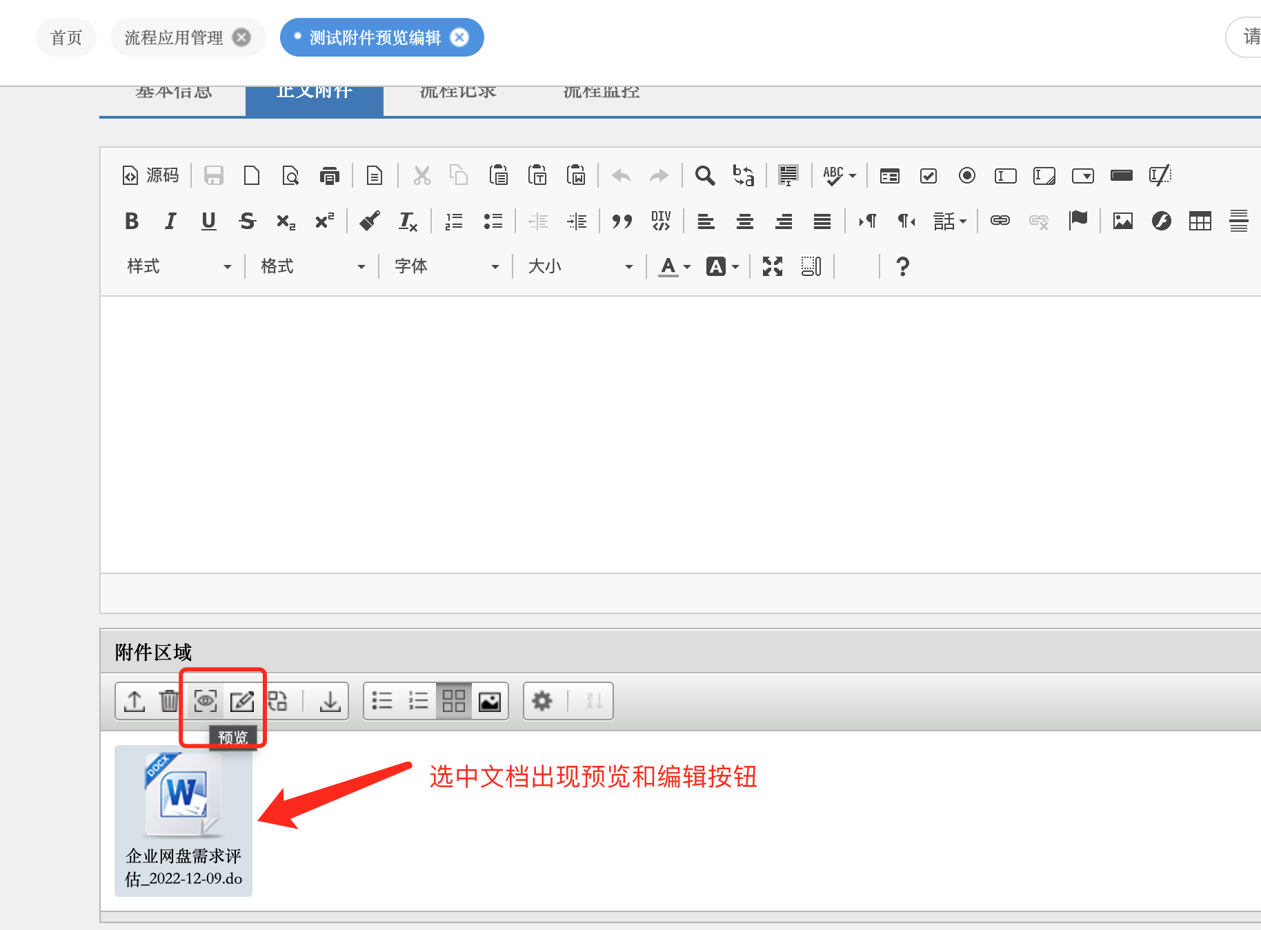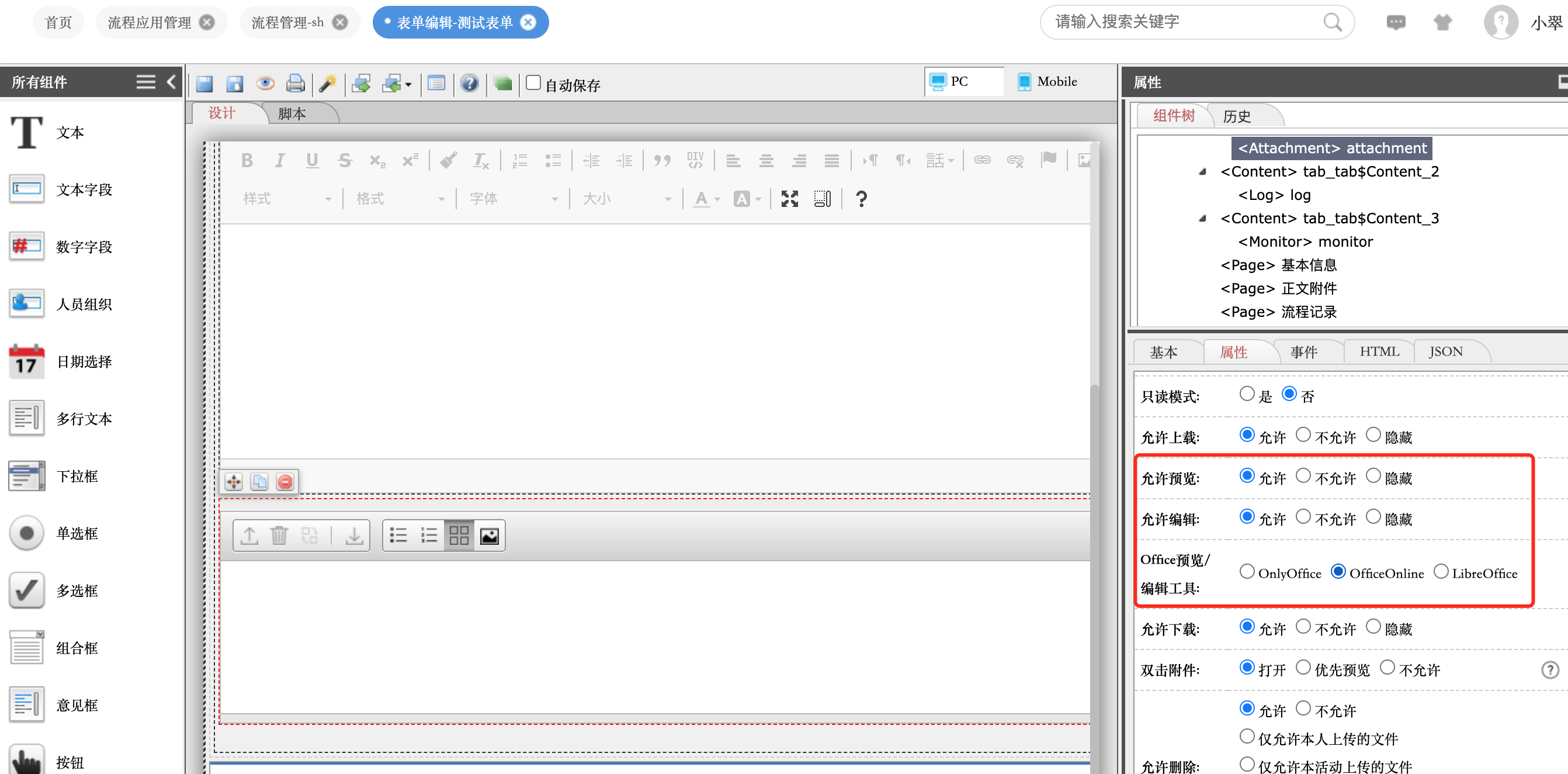 流程附件使用officeonline进行预览或编辑,首先在附件框中配置附件允许预览和编辑,并选择使用officeonline工具: