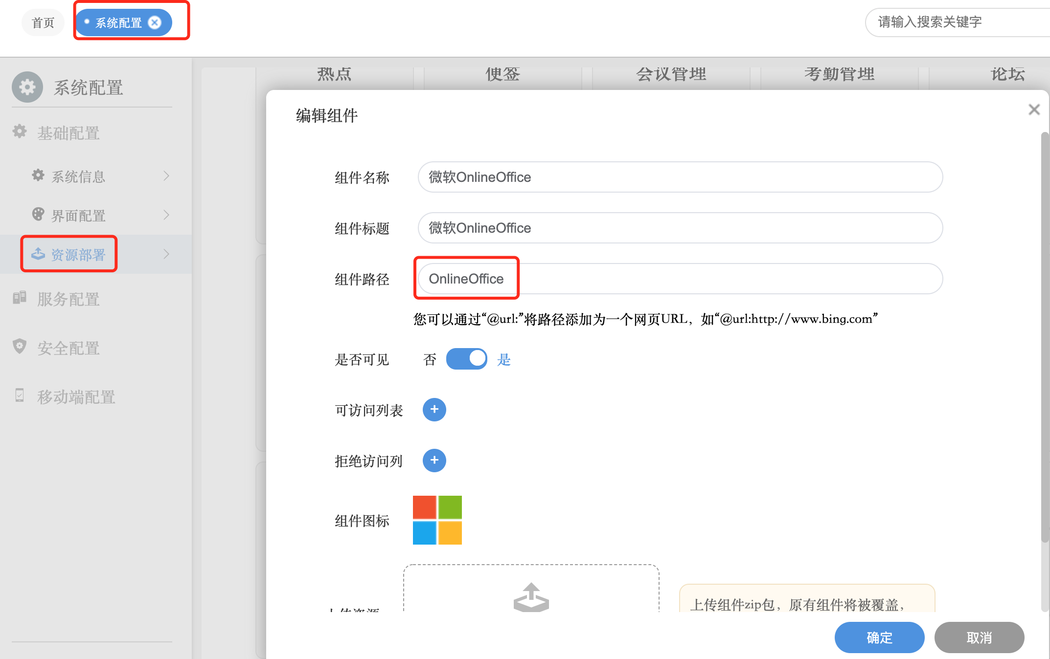 管理员登录到o2oa开发平台,进入主菜单——系统配置——资源部署,在组件部署界面添加组件: