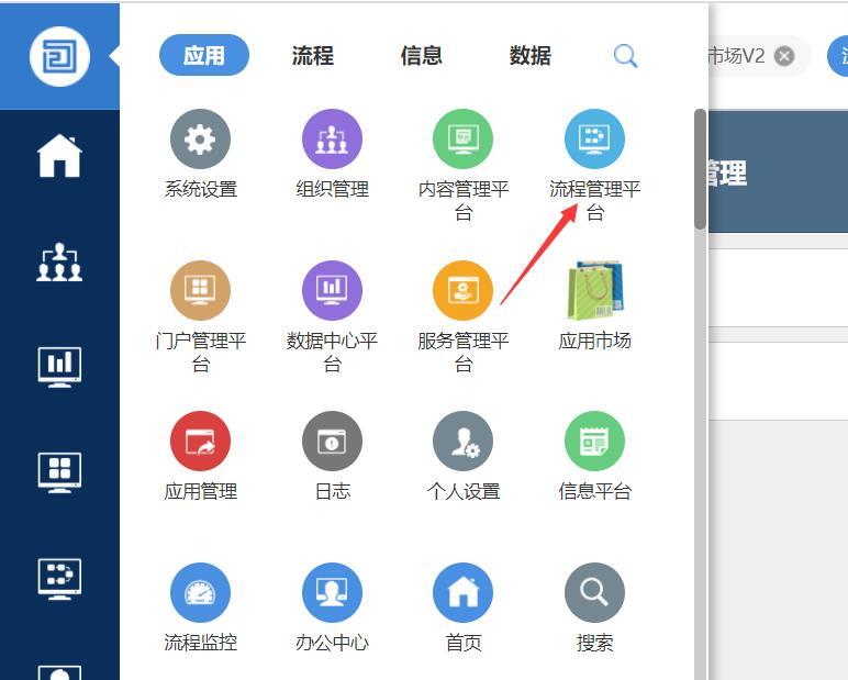 1、以管理员(xadmin)身份登录o2oa开发平台,并且打开应用市场,如下图所示: