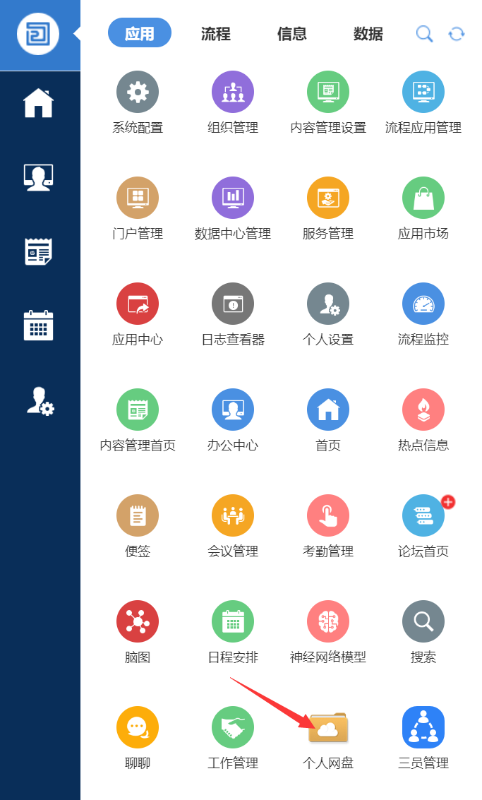 1、打开系统菜单-门户管理,找到应用[个人网盘],点击删除按钮即可删除。