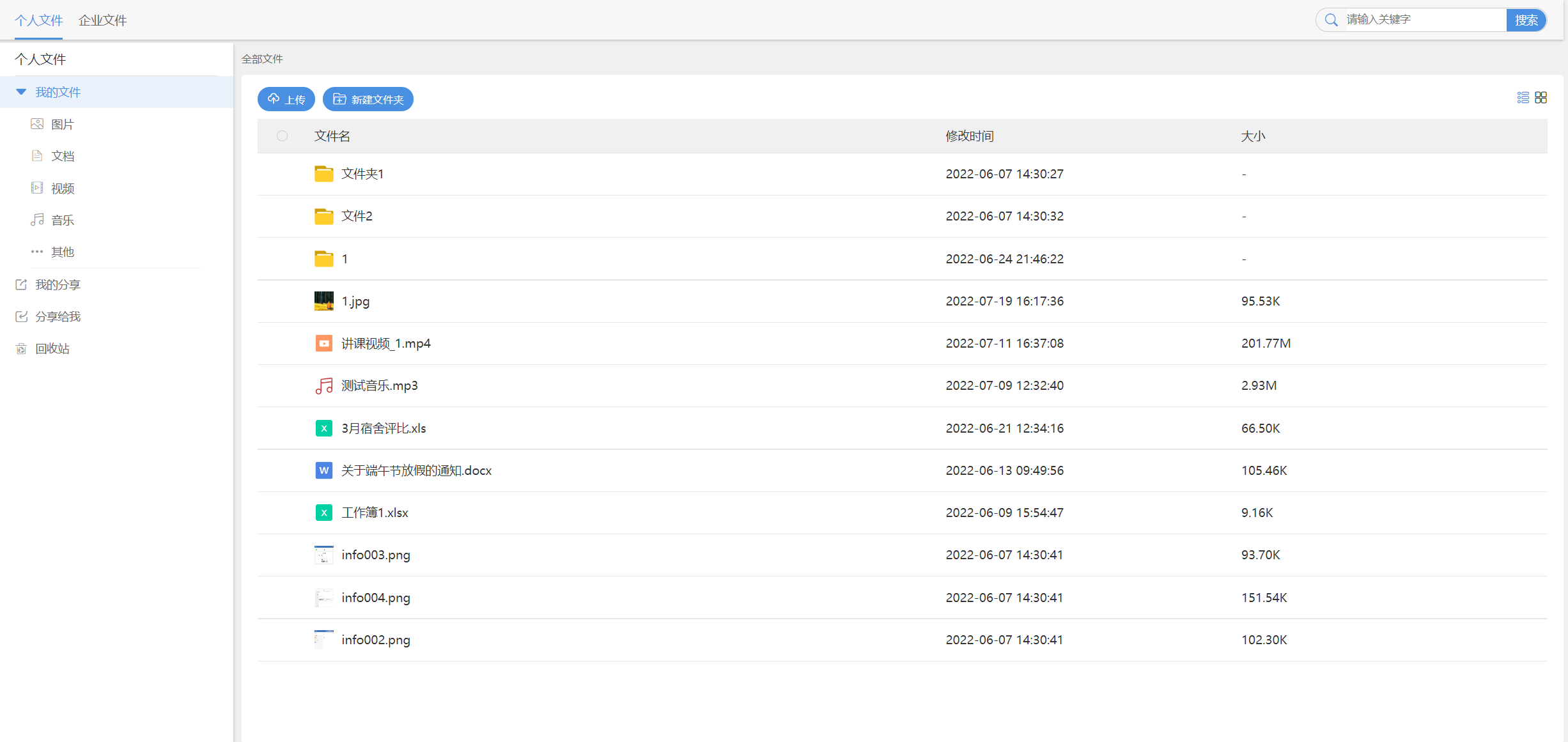 个人文件里包含我的文件、我的分享、分享给我的和回收站列表,用户可以创建、上传、分享文件。