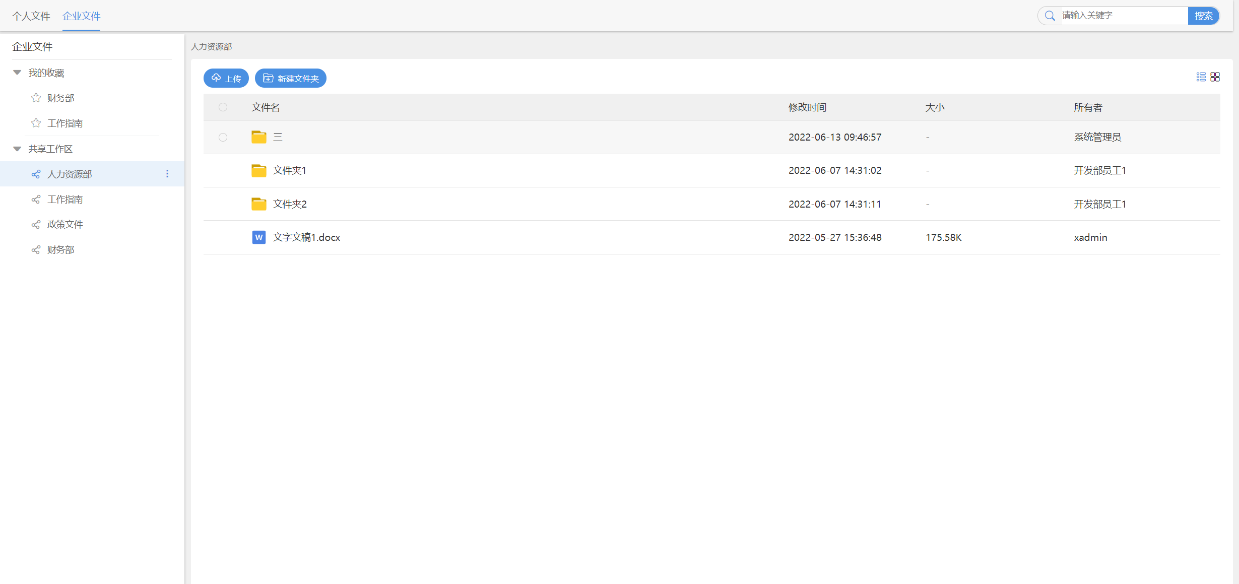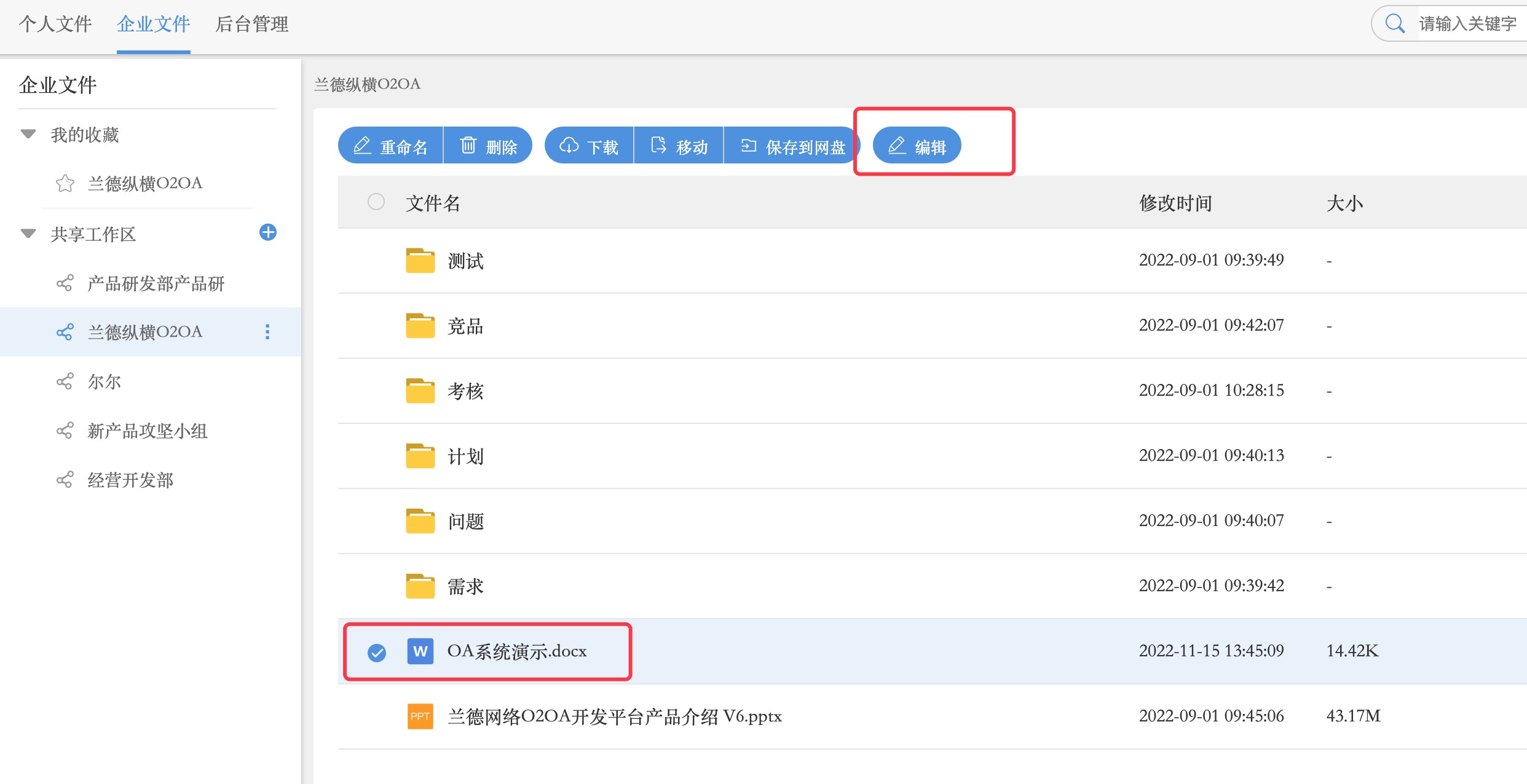 企业文件用于部门和群组共享文件,支持对office文件基于onlyoffice或officeonline的在线协作。