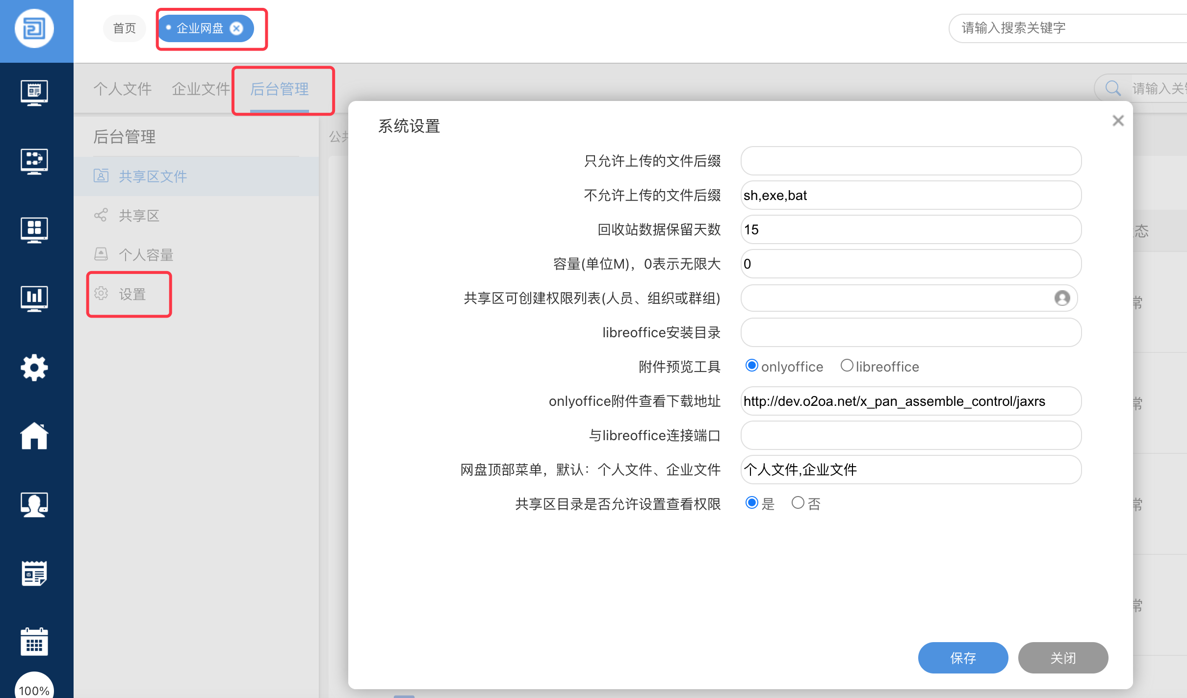 然后进入企业网盘——后台管理——设置,基于需要设置相应配置,如启用onlyoffice预览和在线编辑需要到应用市场下载安装onlyoffice集成应用