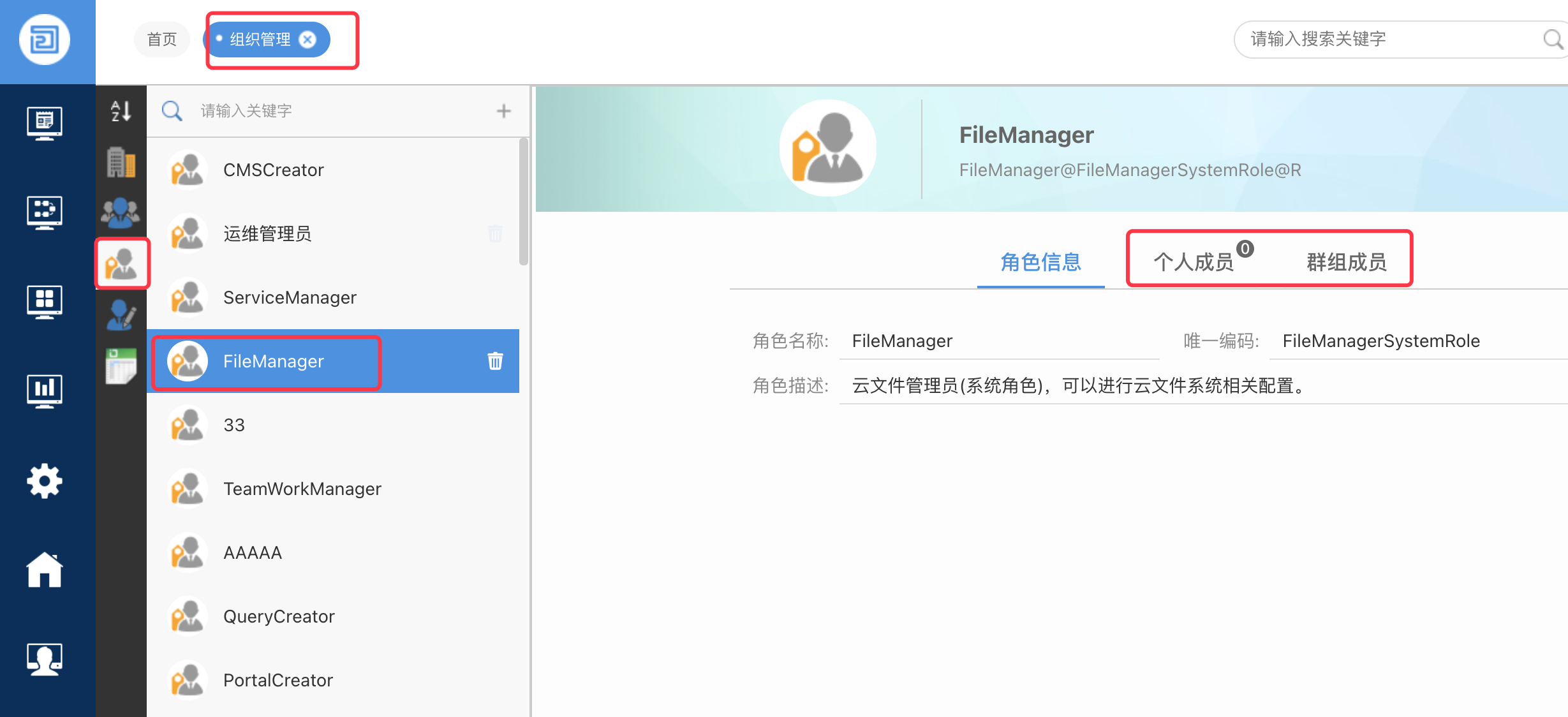 系统管理员登录o2oa开发平台,进入组织管理——角色管理中配置网盘管理员