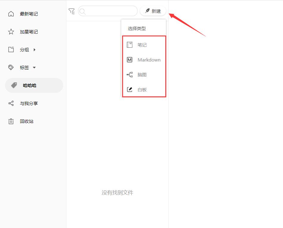 1,新建,新建时可选择笔记类型,笔记、markdown、脑图、白板。