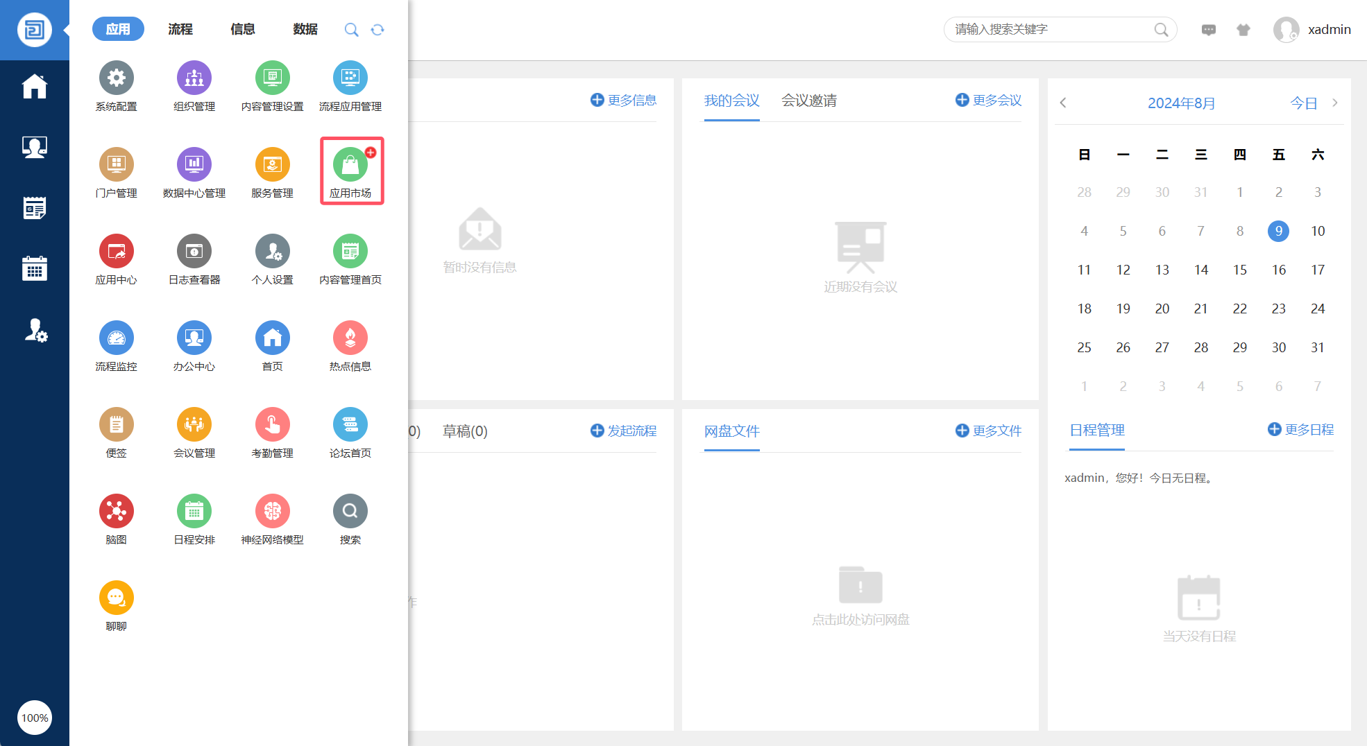1、以管理员(xadmin)身份登录o2oa开发平台,并且打开应用市场,如下图所示: