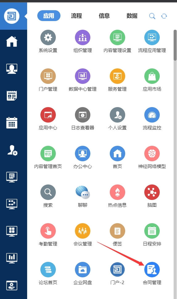 1、打开系统菜单-流程应用管理,找到应用[合同管理],点击删除按钮即可删除