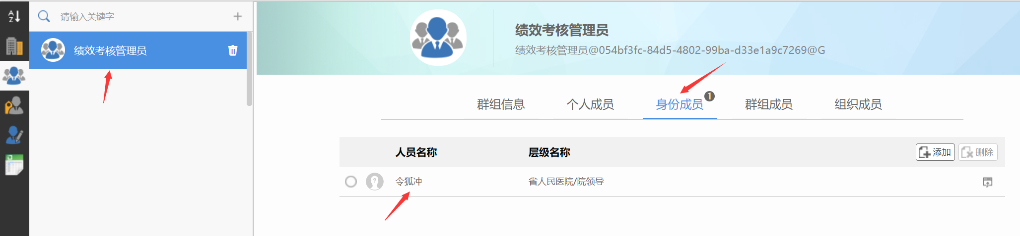 4、在组织管理中,增加名称为“绩效考核管理员”的群组,并在“身份成员”中配置一个管理员。该身份用于流程的“绩效管理员”处理业务。