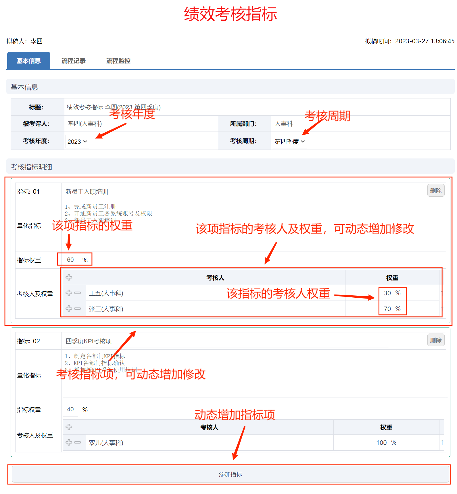 添加当前考核周期内的考核指标(动态添加多个指标),并设置每个考核指标对应的考核人及权重。