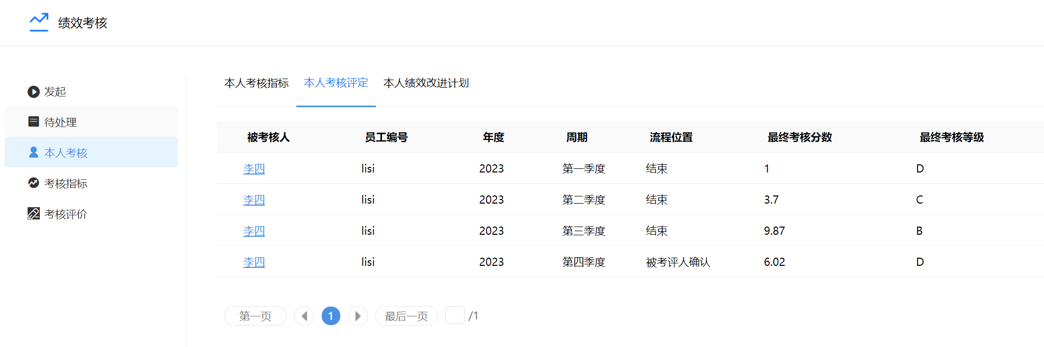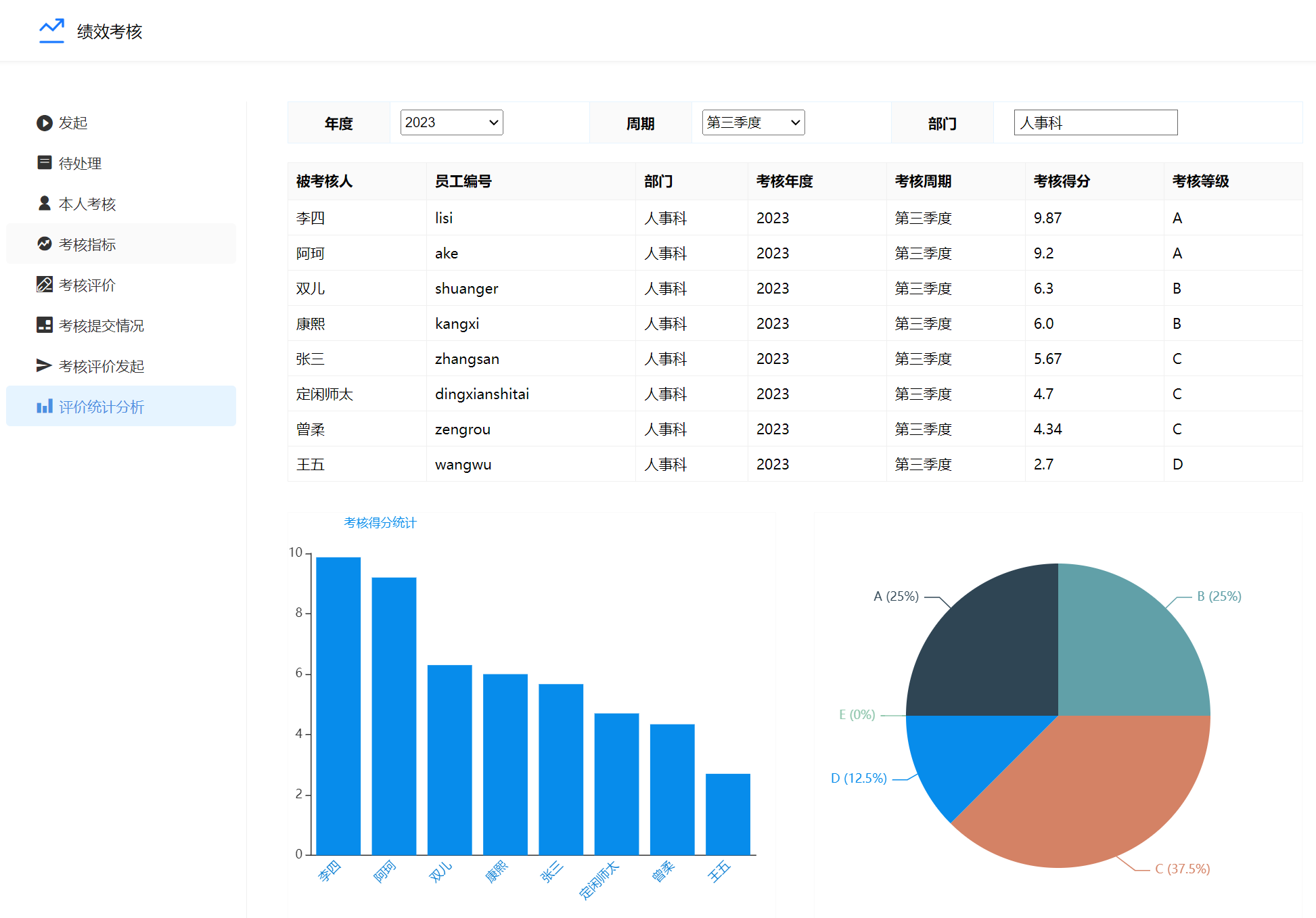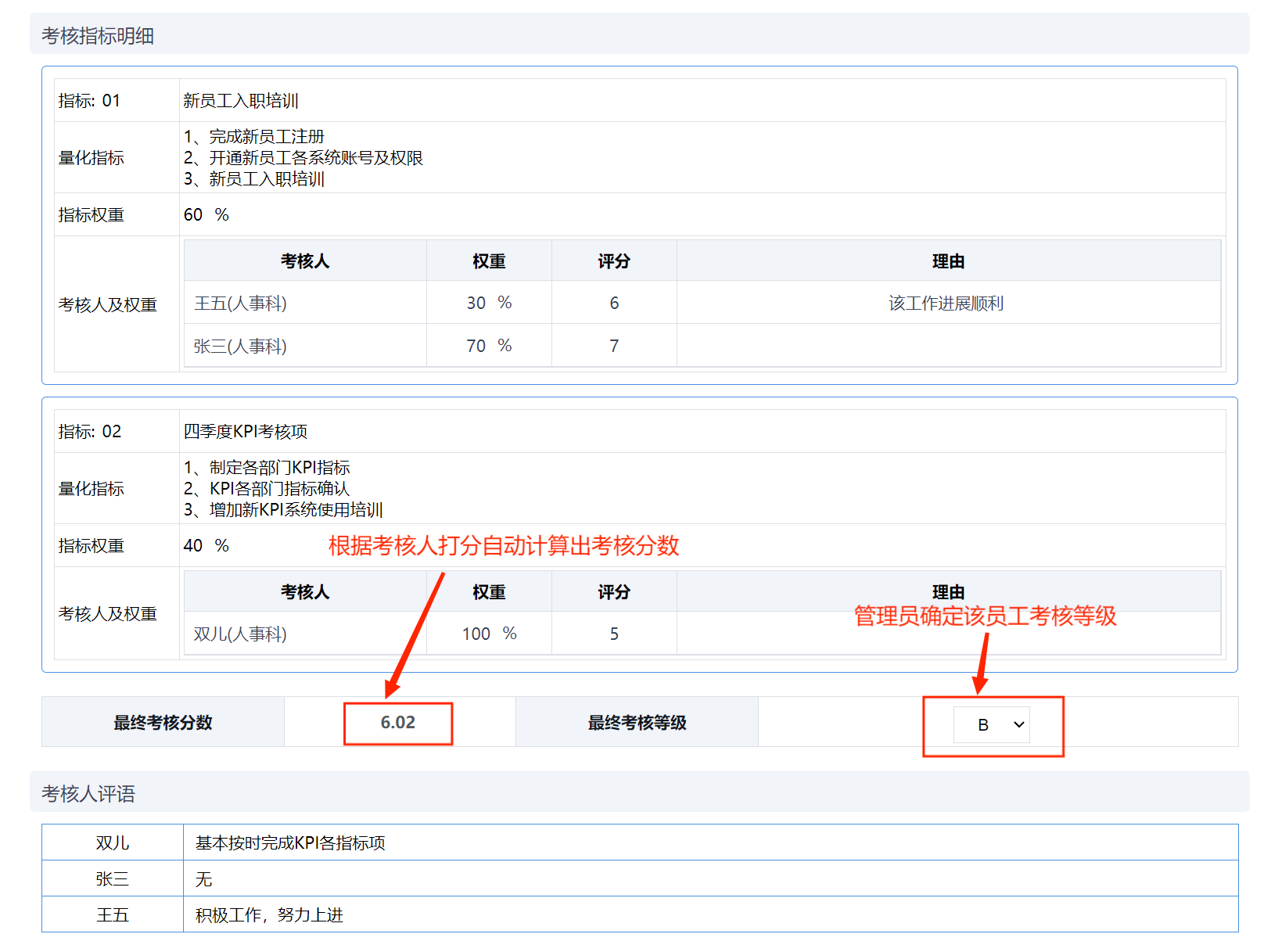所有打分人打完分后在绩效管理员处汇总,系统自动计算出最终得分,管理员根据实际情况确认该用户的最终考核评定等级。