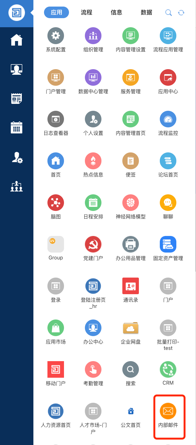 2、打开系统菜单-数据中心,找到应用【内部邮件】,点击删除按钮即可数据中心应用