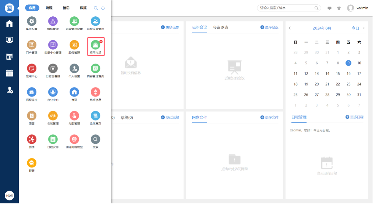 1、以管理员(xadmin)身份登录o2oa开发平台,并且打开应用市场,如下图所示: