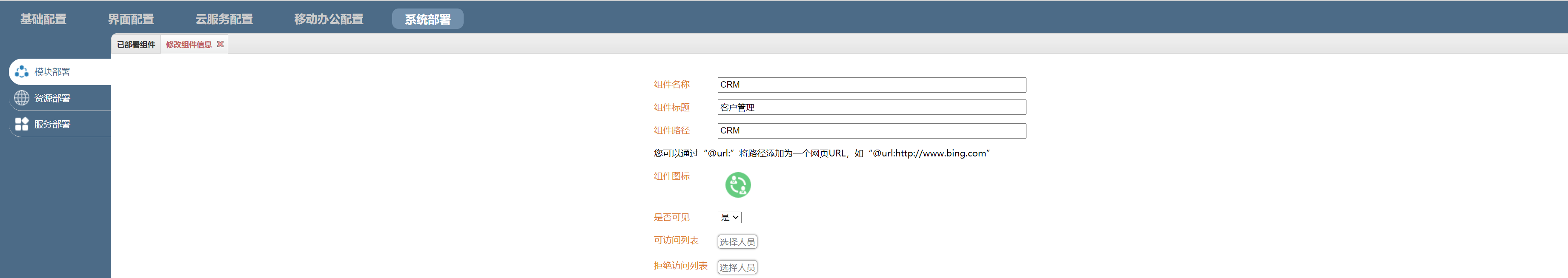 2、点击"部署组件" 组件名称: crm 组件标题:客户管理 组件路劲: crm ,点击部署组件