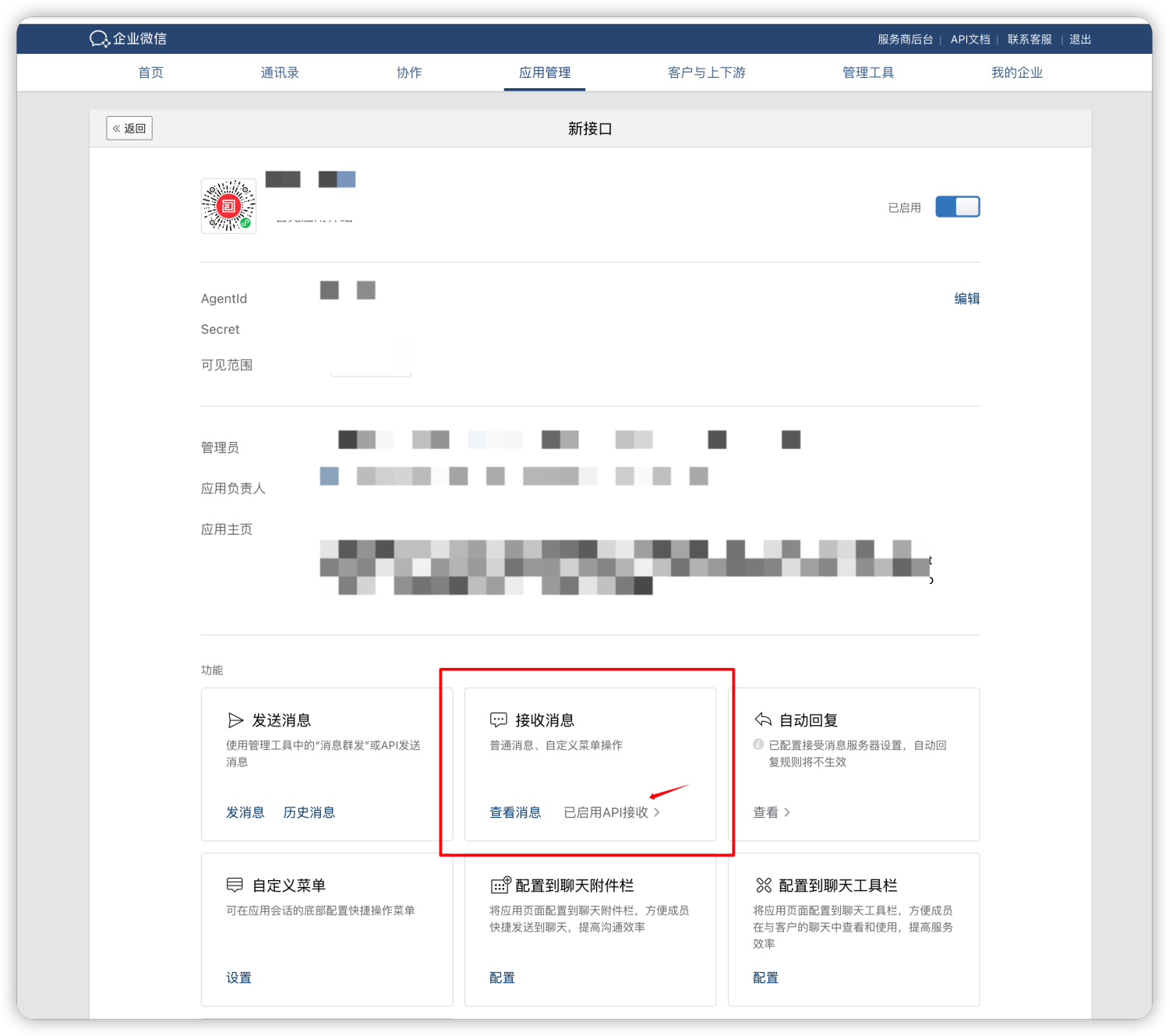 打开企业微信管理端,再打开对应已经接入o2oa开发平台的企业微信内建应用,找到接收消息模块: