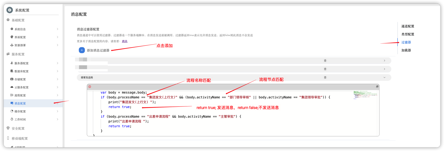 打开o2oa开发平台系统设置->服务配置->消息配置,先可以配置一个过滤器,可以过滤 哪些流程、哪些活动需要发送卡片消息: