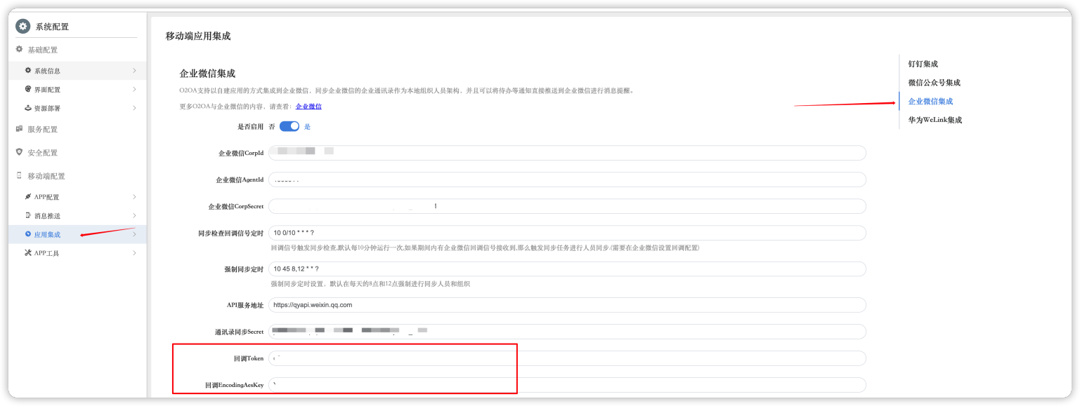 打开o2oa开发平台系统设置->移动端配置->应用集成->企业微信集成: