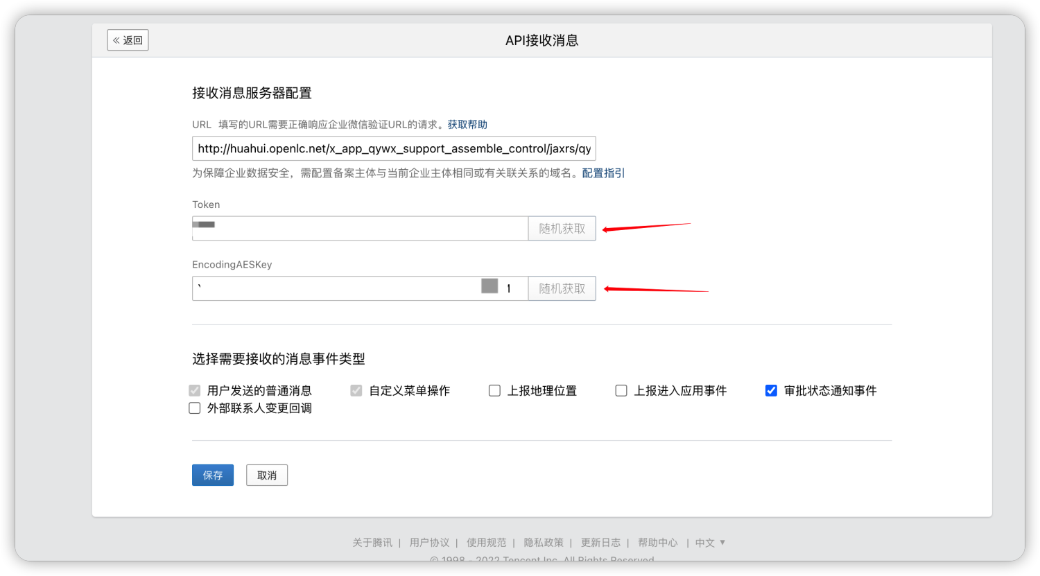 找到里面 回调token 和 回调encodingaeskey,分别填入上面表单中生成出来的token和encodingaeskey,如下: