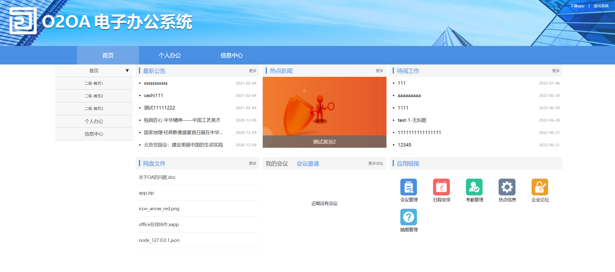 1、金太阳下载首页头部为导航区, 金太阳下载首页、个人办公、信息中心等一目了然,点击则可进入实际页面(部分导航区域模块未开发,可以根据实际需求进行开发修改)。