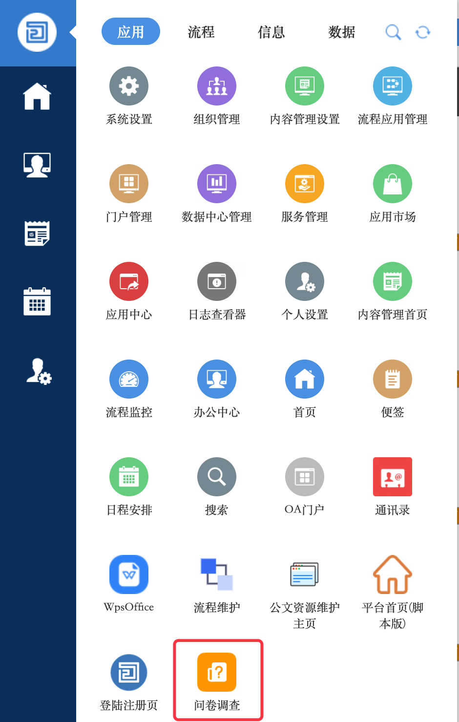 安装后本系统注册用户登录,点击快捷菜单中的“问卷调查”应用