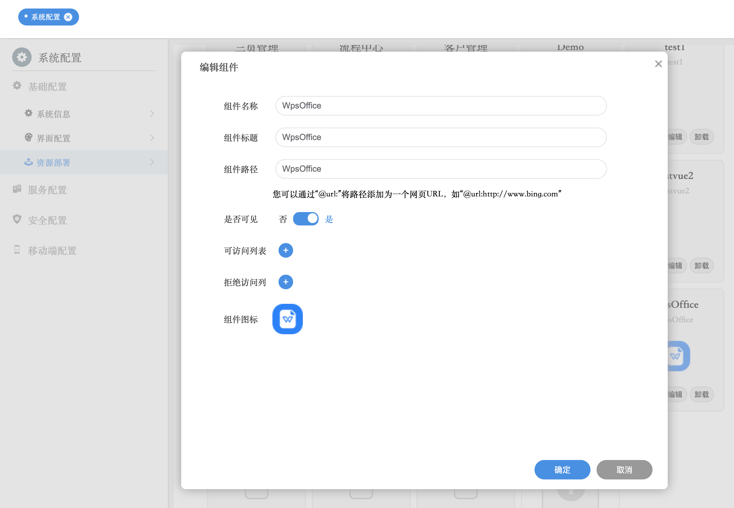 安装后,配置应用 系统设置-资源部署,创建一个 wpsoffice 组件