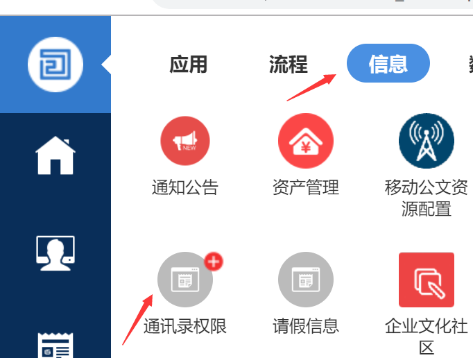 1、用管理员账号在信息应用里打开:通讯录权限。配置公司组织架构查看权限。如果权限不配置,缺省配置文档不存在的情况下打开通讯录只能看到个人通讯录节点。注意:通讯录权限只识别一条配置,如果配置了多条,取第一条。默认普通人也有权限新建,若需要普通人没有权限,可用管理员账号在内容管理中给该应用增加可见范围。