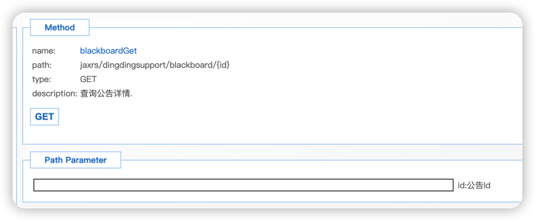 url: /x_app_dingding_support_assemble_control/ jaxrs/dingdingsupport/blackboard/{id} method: get 具体参数说明如下图: