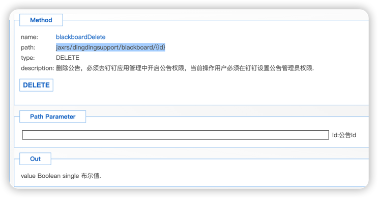 url: /x_app_dingding_support_assemble_control/ jaxrs/dingdingsupport/blackboard/{id} method: delete 具体参数说明如下图:
