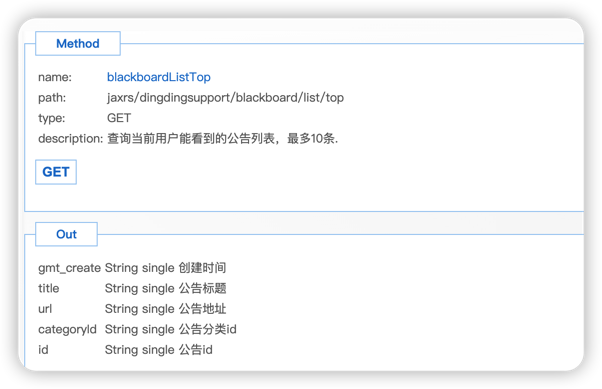 查询当前用户能看到的公告列表,最多10条. url: /x_app_dingding_support_assemble_control/jaxrs/dingdingsupport/blackboard/list/top method: get 具体参数说明如下图: